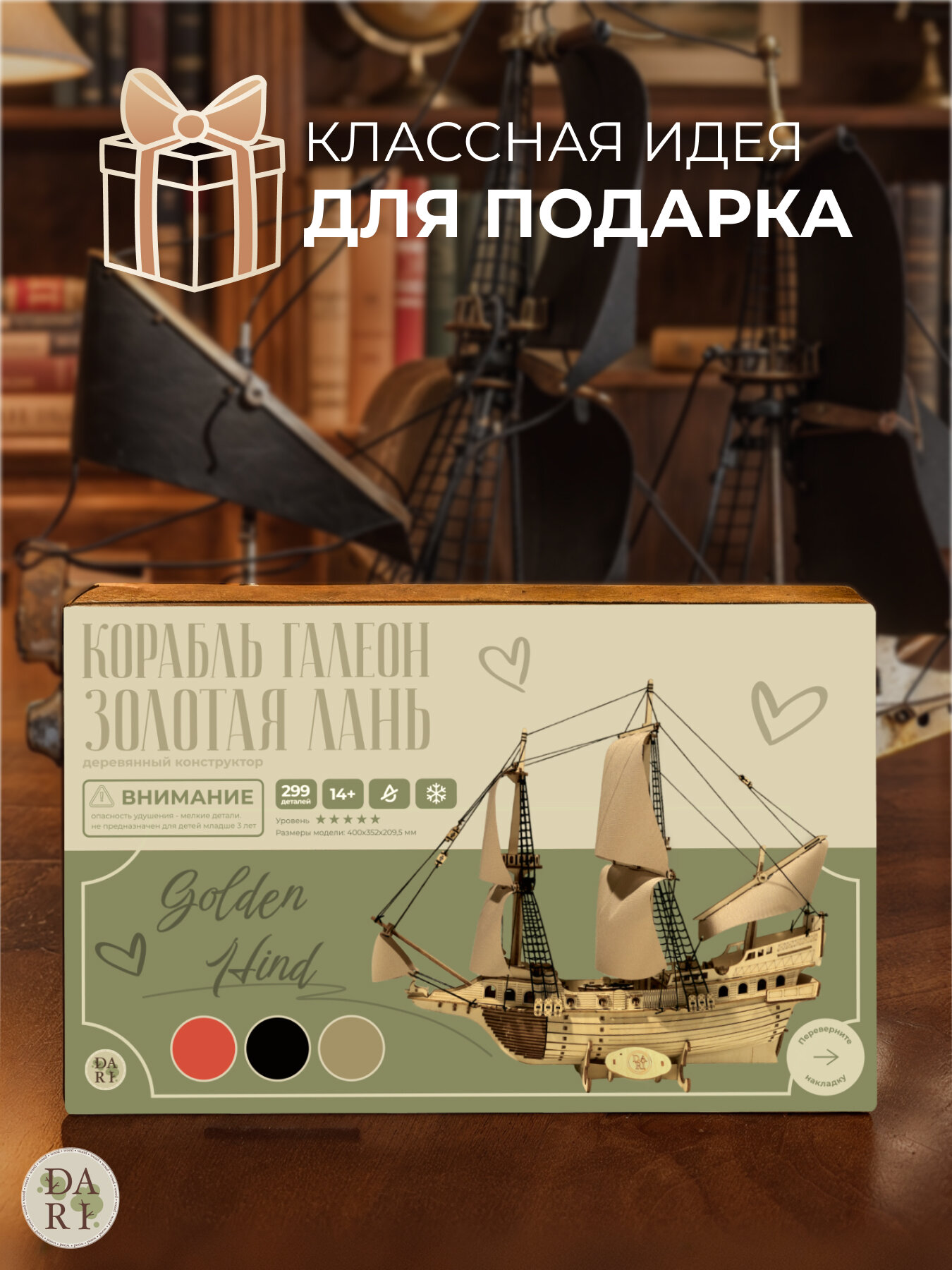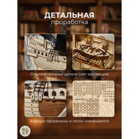 Деревянная модель корабля из дерева "Золотая Лань" от бренда Dariwood — это настоящее приключение в миниатюре, которое оживает в ваших руках. Именно на этом легендарном галеоне сэр Фрэнсис Дрейк совершил своё кругосветное плавание и вошёл в историю как один из самых известных капитанов эпохи Великих географических открытий. Конструктор из дерева — отличный подарок для ценителей морской романтики и коллекционеров. Конструктор для взрослых украсит любой интерьер и станет изюминкой вашей домашней коллекции. Собранная модель корабля "Золотая Лань" порадует реалистичной оснасткой парусов и такелажа, а также возможностью самостоятельной окраски — воплотите свою версию знаменитого галеона! С нашим конструктором деревянным справится любой — детали аккуратно вырезаны из качественной экологичной фанеры, а сборка не требует клея и не вызывает затруднений. Деревянный конструктор способствует развитию мелкой моторики, пространственного мышления, терпения и воображения. Проведите увлекательное время всей семьёй, создавая свою собственную легенду!