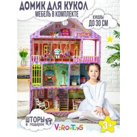 Деревянный 3-х этажный игровой кукольный дом цветной для девочек. Такой игрушечный домик украсит любой детский праздник и день рождения, такая игрушка подарок-мечта любой девочки. Мебель в кукольный домик входит в набор. Дом для кукол мечта каждой девочки, изготовлен из чистого и безопасного материала - ХДФ, толщиной 3 мм. Собирается между собой в пазы, как конструктор, без клея. Продается в разобранном виде с пошаговой инструкцией. Большой кукольный домик впишется в интерьер любой детской комнаты. Лучше всего для такого дома подходят куколки и герои ваших любимых мультфильмов высотой до 30 см. Уютный, яркий дом просторный для игры с куклами и вместительный для мебели. Деревянный домик c балконом, кухонной мебелью, ванной комнатой и спальней с кроватями. Детали продуманы до мелочей!
