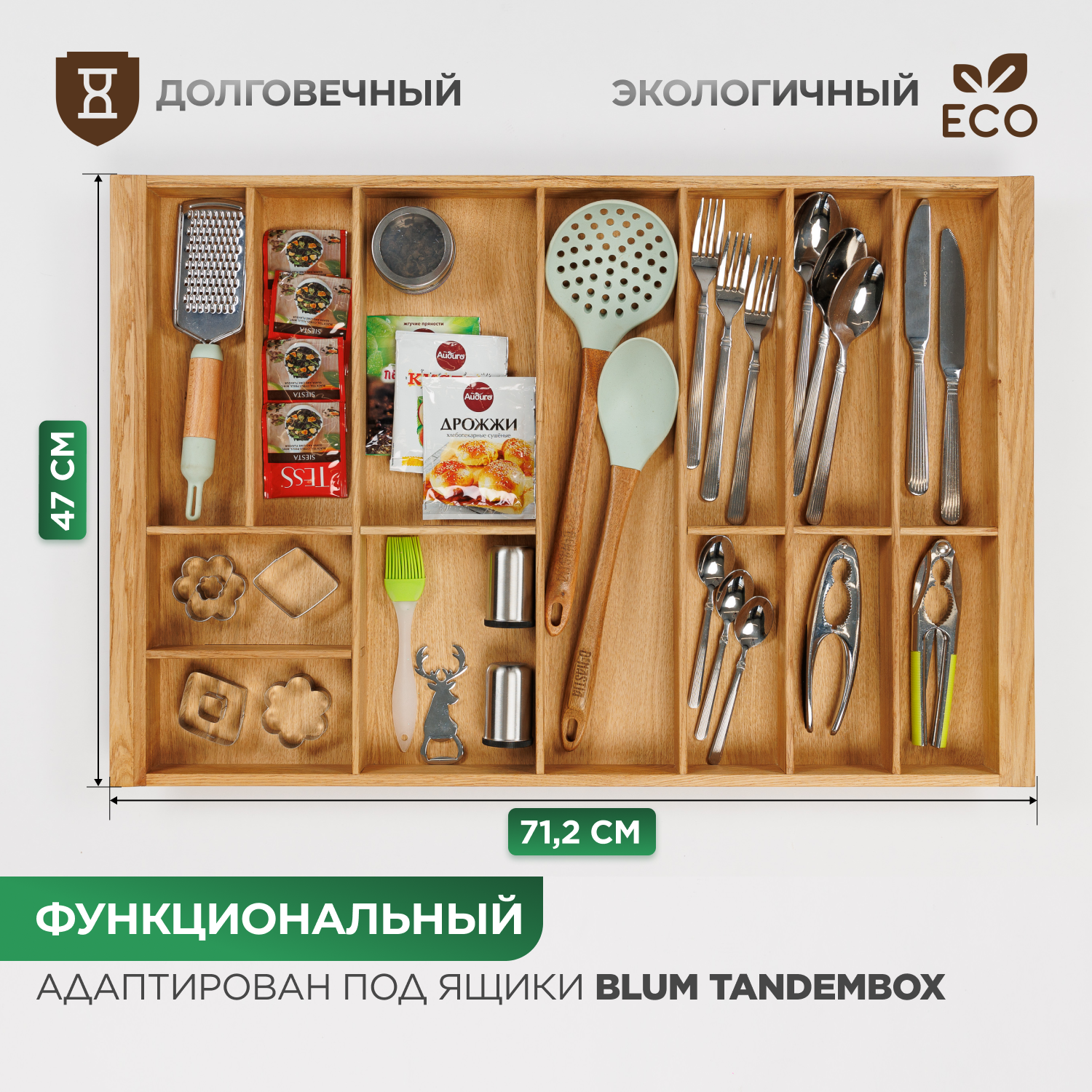 Деревянный лоток из массива дуба для столовых приборов в ящик Blum TANDEMBOX. Идеальный и стильный органайзер для столовых приборов из натурального дерева. Лоток предназначен для хранения столовых приборов и кухонного инвентаря. Изготовлен вручную. Пропитан натуральным маслом.