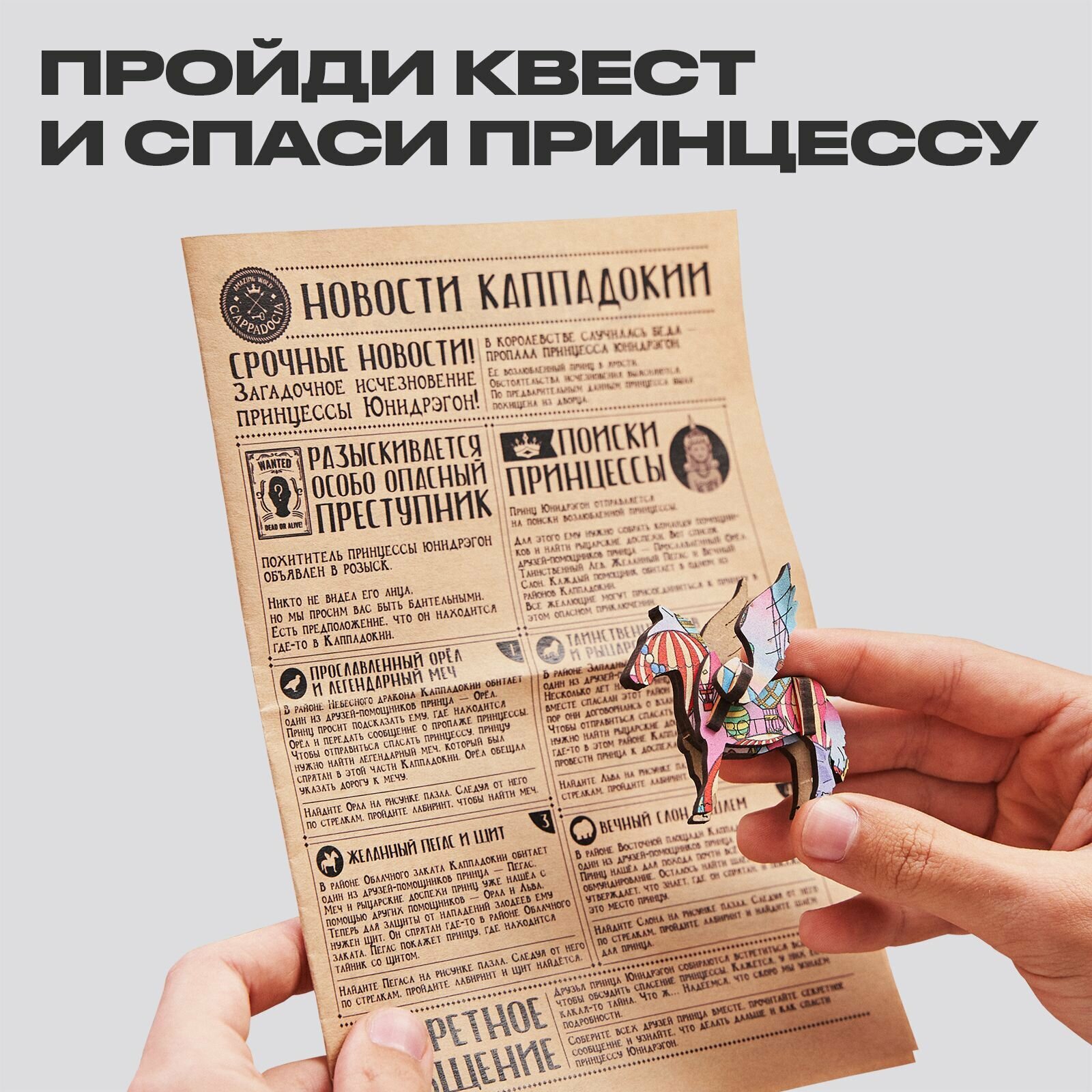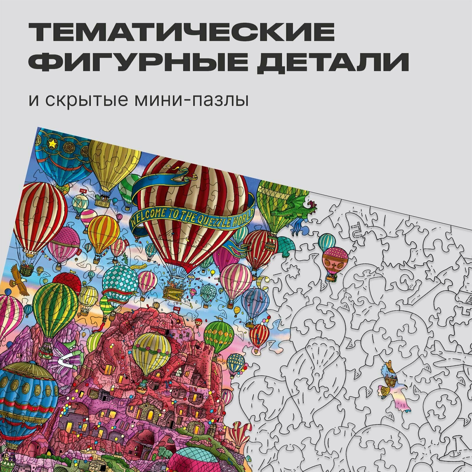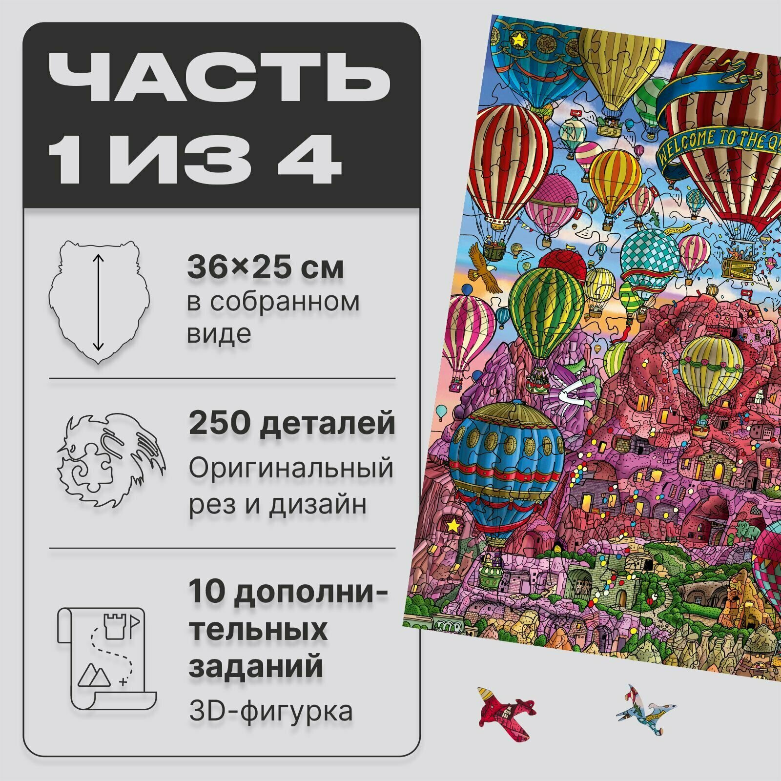 Quezzle — это совершенно новый формат в мире пазлов и головоломок. Это невероятно интересный пазл в сочетании с множеством заданий и главным квестом. Яркий детализированный мир от дизайн студии IC4Design с сотнями персонажей и их историями. Уникальные фигурки и множество деревянных деталей необычной формы перенесут вас в атмосферу Каппадокии. После сборки всех районов вас ожидает увлекательное приключение в мире тайн и загадок. Шаг за шагом вам предстоит проходить лабиринты, отыскивать героев, собирать секретные пазлы и многое другое. Quezzle состоит из 4х частей-районов, у каждого из которых есть свое название, вместе они объединяются в Удивительный мир Каппадокии. Каждая часть это отдельная коробка с индивидуальным дизайном. В каждой коробке по 250 кусочков (фигурок, пазлов). Данный товар является первой частью Quezzle, которую вы можете собрать как отдельный пазл, чтобы насладиться высокодетализированной картинкой от студии IC4Design и качеством пазлов Unidragon. Особенностью Quezzle является то, что в нем сосчитается несколько игровых механик. Это яркий, детализированный пазл из 250 уникальных кусочков. Механика поиска предметов. Множество деталей, персонажей и сюжетов, которые можно разглядывать часами и искать предметы. В каждой части Quezzle есть отдельные и общие задания, по итогу прохождения которых вы выполняете основной квест.