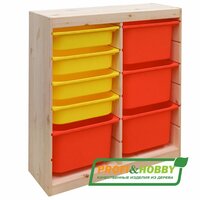 Купить Деревянный стеллаж труфаст 87х30х91 вертикальный двойной с желтыми (4 шт) и оранжевыми (4 шт) контейнерами с доставкой по всей России.