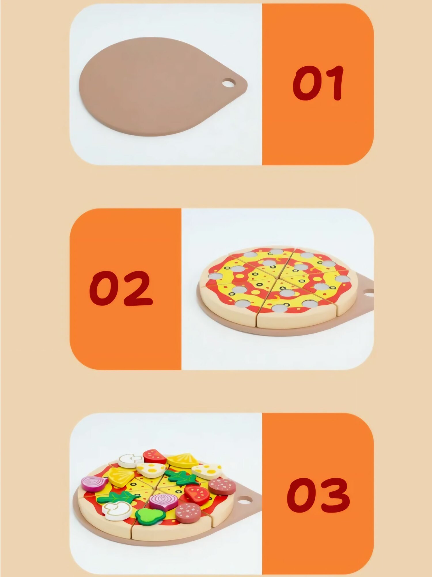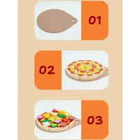 В набор входит множество деталей, имитирующих разнообразные ингредиенты для приготовления пиццы – от сочных кусочков помидоров и сыра до зелени и колбасы. Все элементы выполнены из высококачественной древесины и окрашены безопасными, нетоксичными красками, что гарантирует безопасность во время игры. Дети смогут легко собирать и разбирать свою «пиццу», тренируя мелкую моторику и координацию движений.