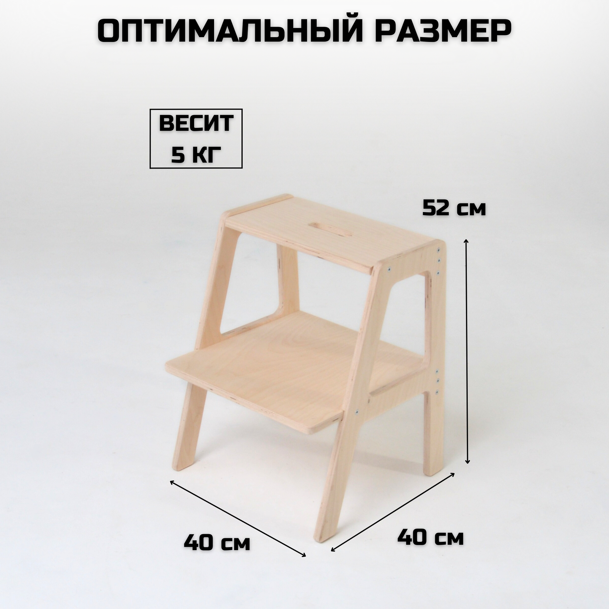 Многофункциональный табурет-стремянка. Идеально отшлифован. Табурет стремянка станет верным помощником по дому. Идеально впишется как интерьерное решение для кухни, как деревянная мебель для прихожей, для дачи, для детской. Табуретка может служить и как стремянка, и как подставка. У вас есть дети? Вашему ребёнку больше не придётся карабкаться на высокий стул, чтобы что-то достать из верхнего кухонного ящика или тянуться до раковины - можете быть спокойны, табурет крепкий и устойчивый, но при этом выглядит аккуратно. За счет выреза сверху - его легко переставлять, а весит он 4,8кг. Может служить прикроватным столиком. На этой табуретке отлично разместятся цветы, книги. В высоту - 52см. В ширину и глубину - 40см. Табурет - это прочное и качественное изделие из дерева и выдерживает вес до 120 кг. Выполнен из березовой фанеры ФК 2/2. Весит 5,2кг. Как итог, данный табурет - это отличная дачная, кухонная, детская мебель и просто незаменимый помощник в доме. Не нуждается в дополнительной шлифовке.