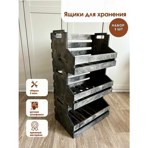 Деревянный ящик набор из 3-х ящиков, сборный стеллаж для хранения овощей банок, картофеля, цвет: черный графит: сравнение цен, характеристики, фото, актуальное наличие и цены.