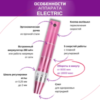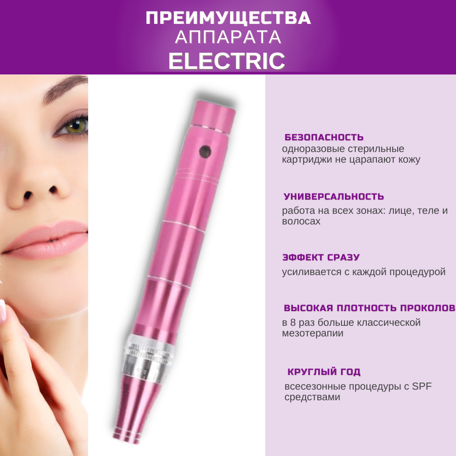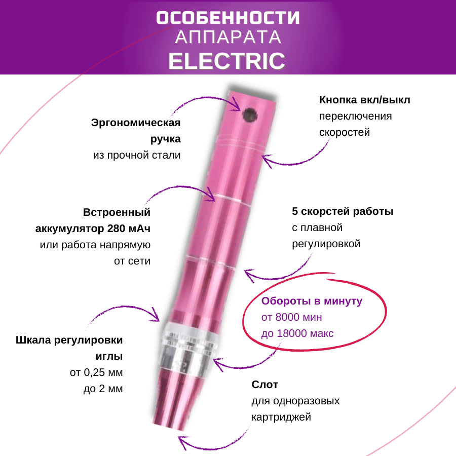 Подходят картриджи: на 12 игл, на 9 игл, на 36 игл, НАНО-картриджи Зоны для применения: лицо, шея, декольте, тело, веки, голова (волосы) Толщина игл: 0.23 мм (32G) Возможная длина игл: плавная регулировка от 0.2 мм до 2 мм