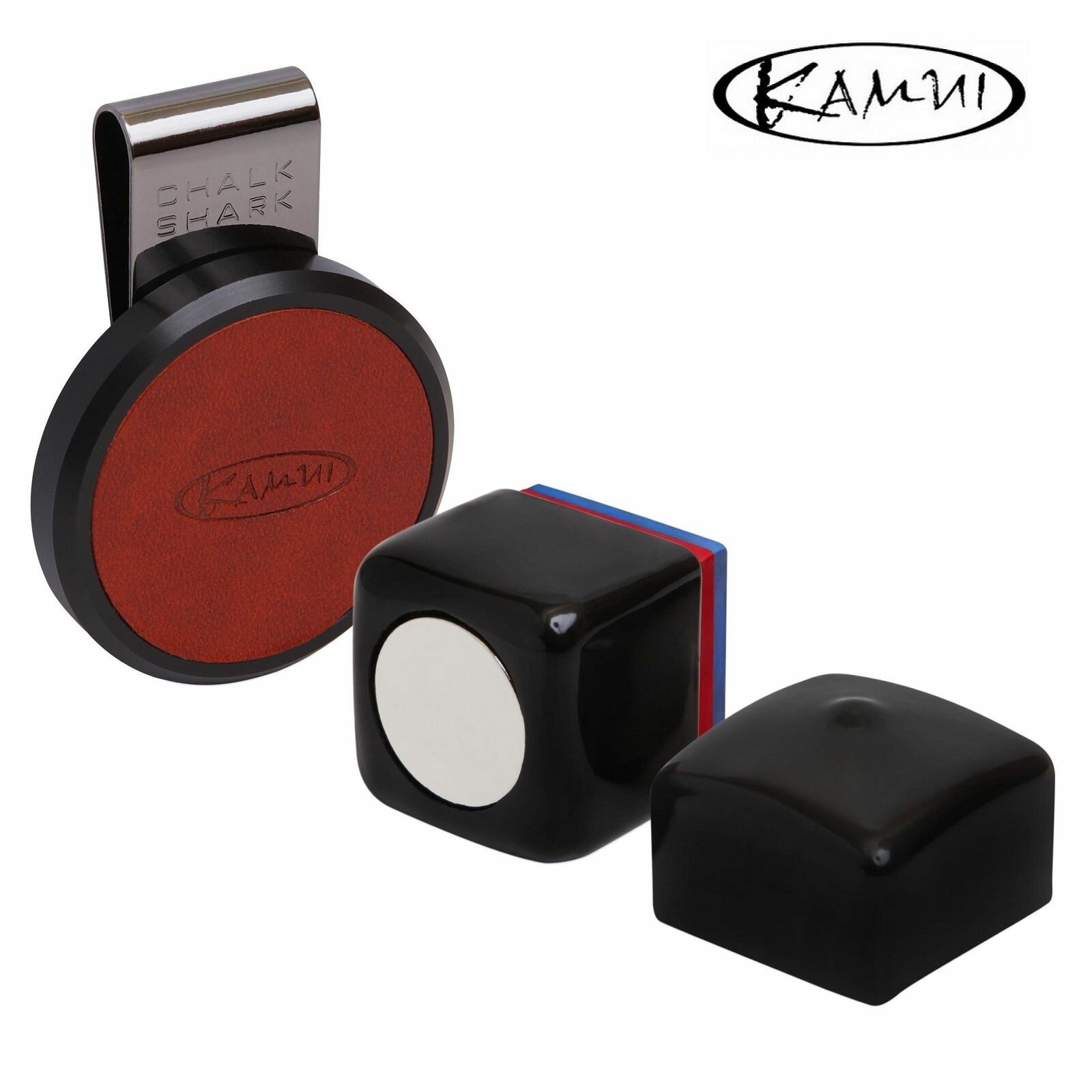 Бильярдный держатель Kamui произведен из металла и натуральной кожи, а пенал для мела выполнен из плотного силикона. Комплект обладает мощной двойной магнитной системой. Магнит расположен в круглом держателе, а пенал имеет металлическую пластину, что обеспечивает надежную фиксацию даже при случайном задевании рукой во время удара.