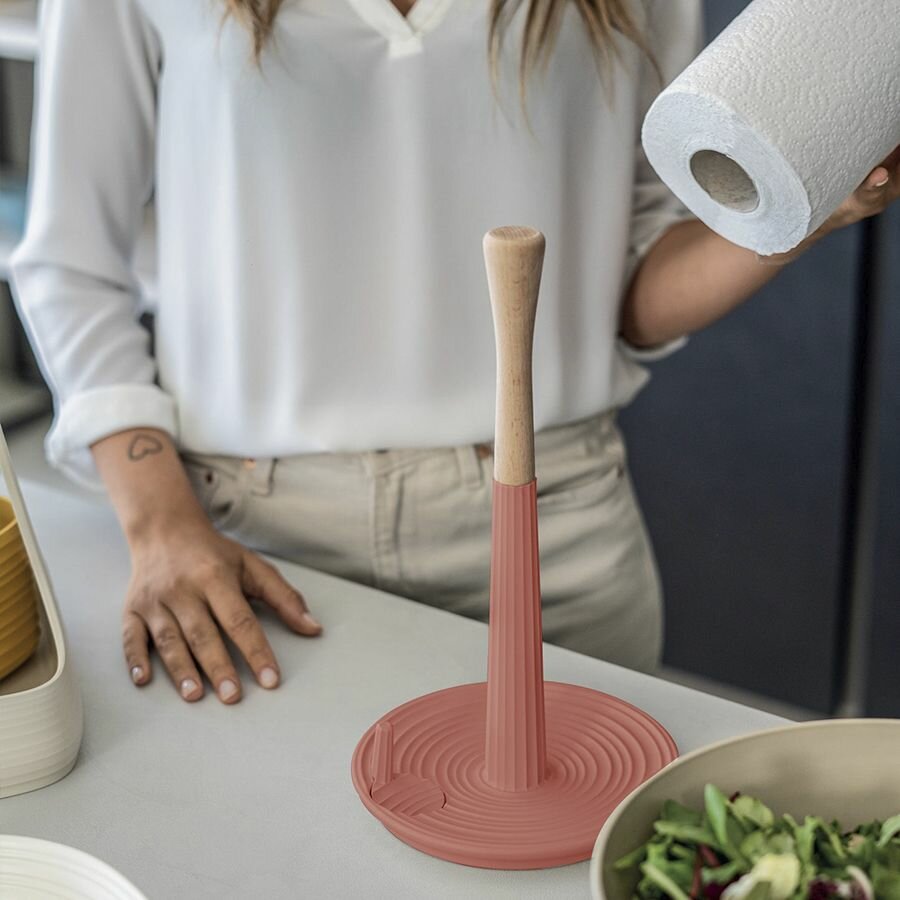 Держатель для бумажных полотенец Tierra выполнен из переработанного пластика с элементами из дерева. Материал имеет антибактериальные свойства, создавая на своей поверхности защитный барьер, препятствующий размножению бактерий. Держатель оснащен регулируемым фиксатором листа, который адаптируется под размер рулона и позволяет аккуратно оторвать кусок бумаги нужного размера. Дизайн изделия напоминает керамику, а реалистичность внешнему виду придают тщательно подобранные пастельные тона и неровные круговые узоры, создающие эффект ручной работы.