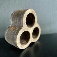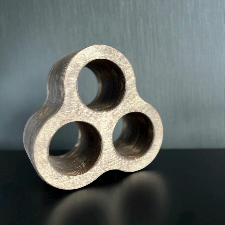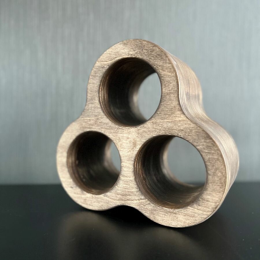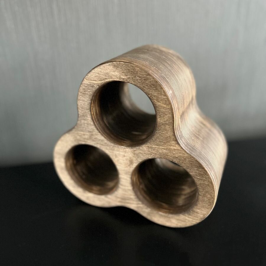 Особенностью держателя является его параметрическая форма в виде пирамидки. Это позволяет разместить на нем до трех бутылок, создавая при этом гармоничную композицию.