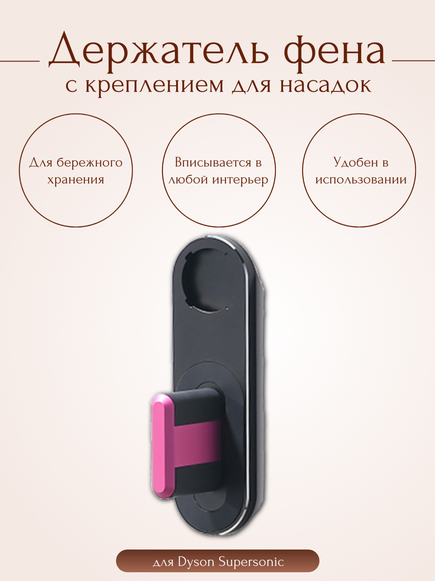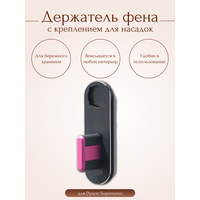 Держатель для фена Dyson Supersonic с креплением для насадок BW-03-1 Материал: алюминиевый сплав Цвет: черный, розовый Держатель для фена может крепиться на двух саморезах (саморезы и дюбели в комплекте) или с помощью клейкой ленты (в комплекте) Фен и насадки в комплект не входят!