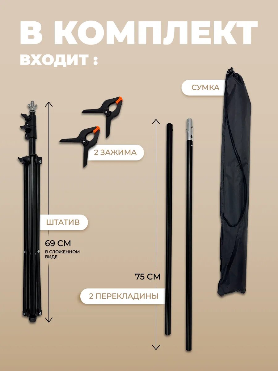 Хотите порадовать друга или фотографа значимым подарком? Стойка для фотофона - это практичный и полезный подарок, который пригодится каждому, кто ценит качество снимков. В комплект входит: штатив - 1шт, сумка - 1 шт, зажим - 2 шт, перекладина 75 см - 2 шт.