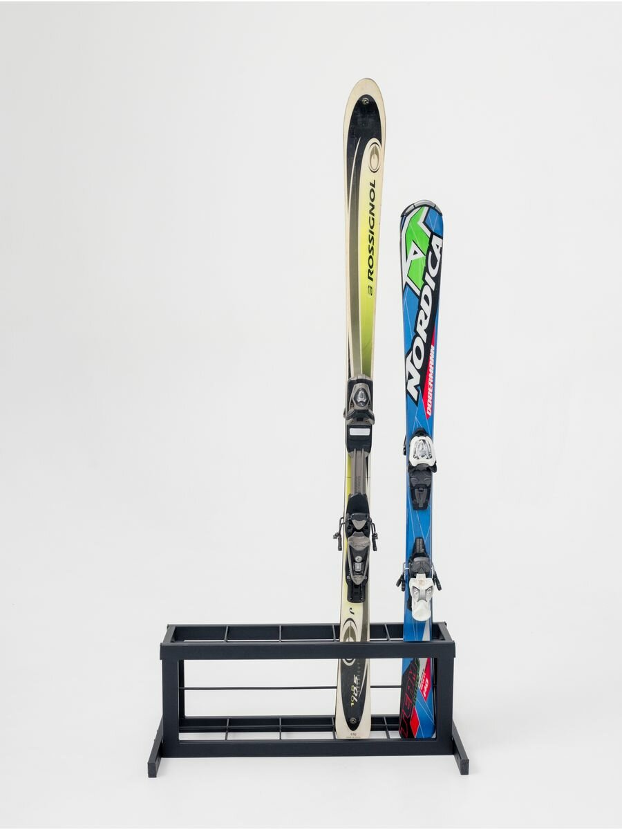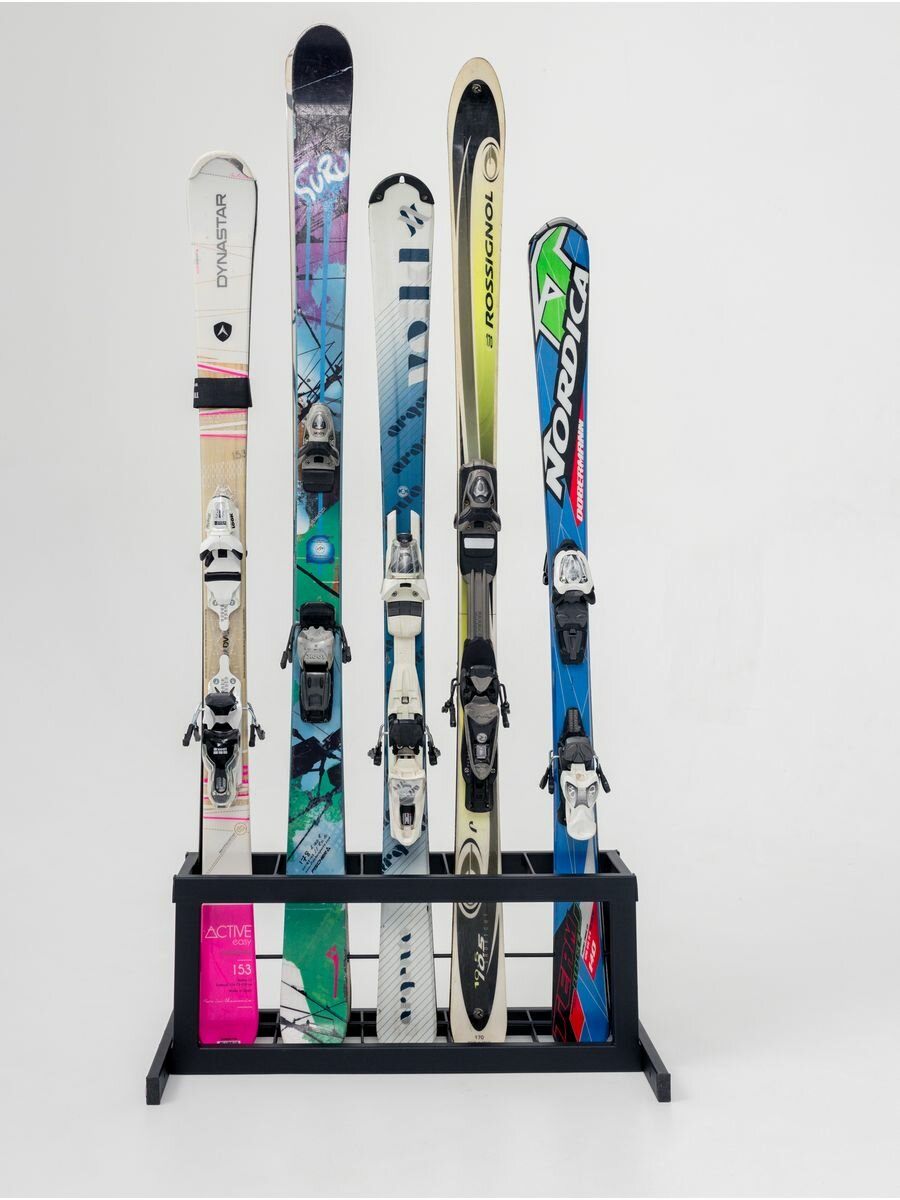 Вмещает до 5 пар горных лыж и палок. Выполнена полностью из металла, имеет внушительный вес, и 2 опоры, за счет чего держатель со спортивным оборудованием не опрокинется и удержит весь инструмент.