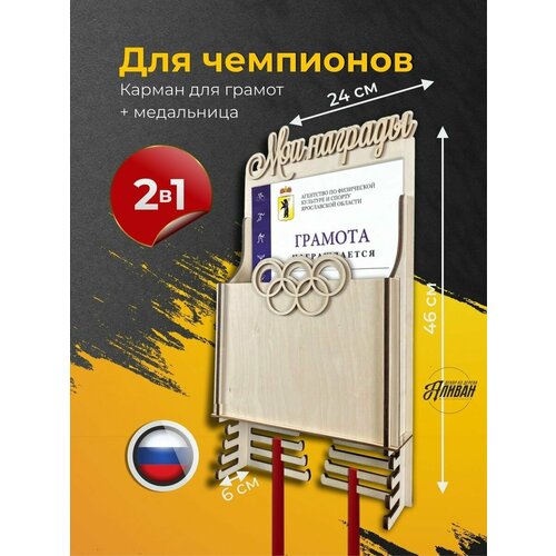 Держатель для медалей спортивная с карманом для грамот «Олимпийские кольца» 2 в 1 в натуральном цвете: сравнение цен, характеристики, фото, актуальное наличие и цены.