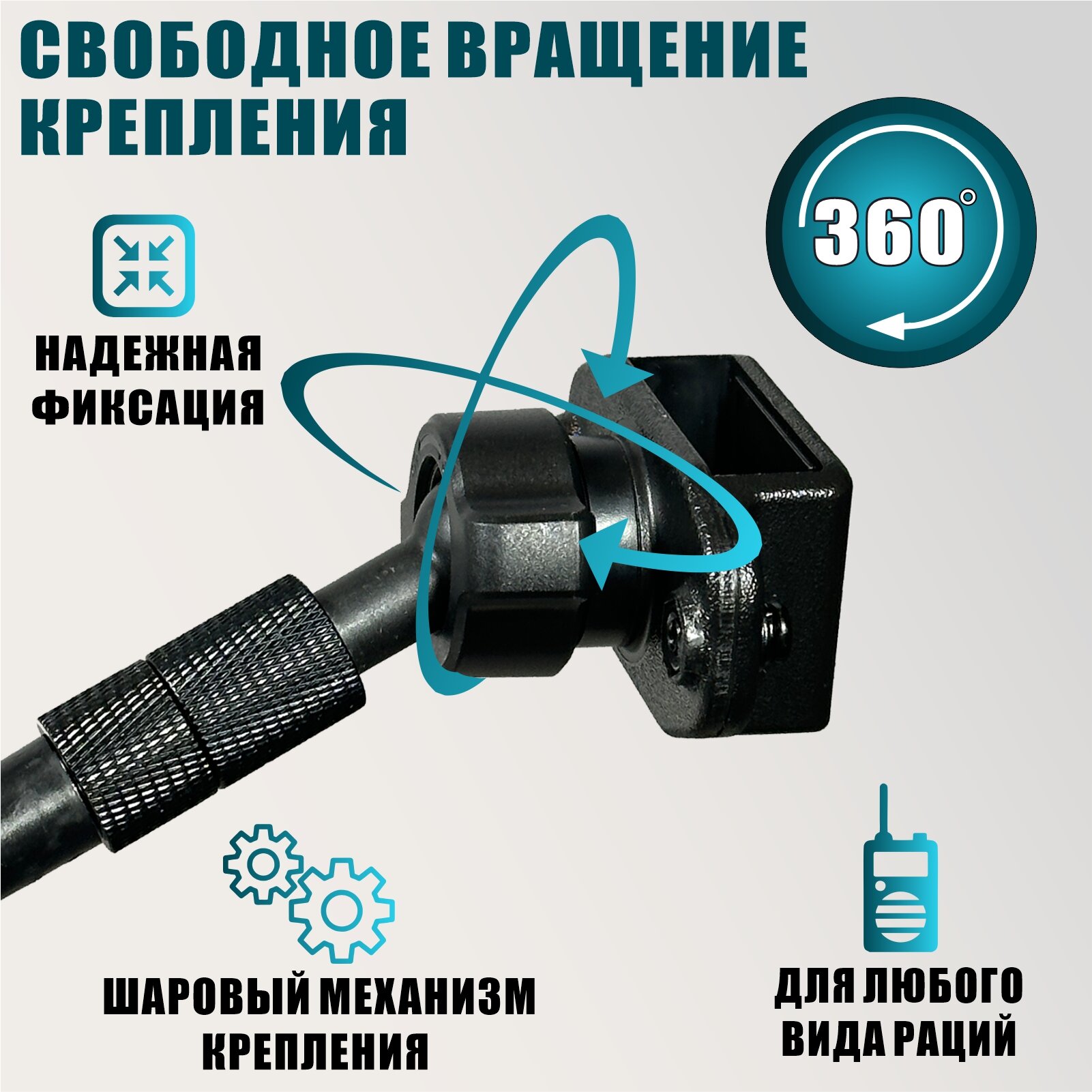 Крепление поворотное фиксируется с помощью гибкой ножки и может регулироваться для установки удобного положения. Клипса для рации надежно фиксирует устройство, не позволяя ему сместиться или выпасть.