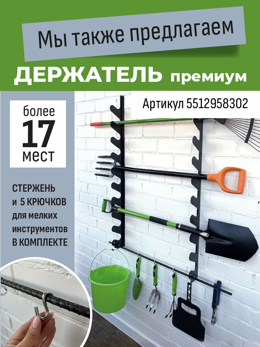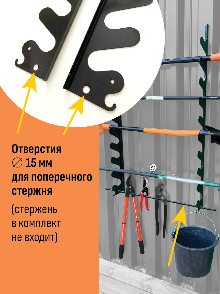Настенный держатель для инвентаря- необходимый атрибут вашей дачи, гаража, сада и огорода. В комплект входят два кронштейна длиной 118 см, специально разработанных для удобного и компактного хранения ручных инструментов (лопат, грабель, вил, удочек и т. д.). Благодаря этому продуманному решению, ваши инструменты всегда будут находиться под рукой, не будет занимать ценное место на земле или в шкафу. Кронштейн способен вместить 10 единиц инвентаря, обеспечивая их безопасное и организованное хранение. Дополнительно кронштейны имеют 2 крючка + технологические отверстия Ф15мм для поперечного стержня на который ласт место для дополнительного хранения инструментов , перчаток и т. д. Это простое, но эффективное устройство значительно упростит вашу работу на участке, позволяя вам легко и быстро найти необходимый инструмент в любое время.