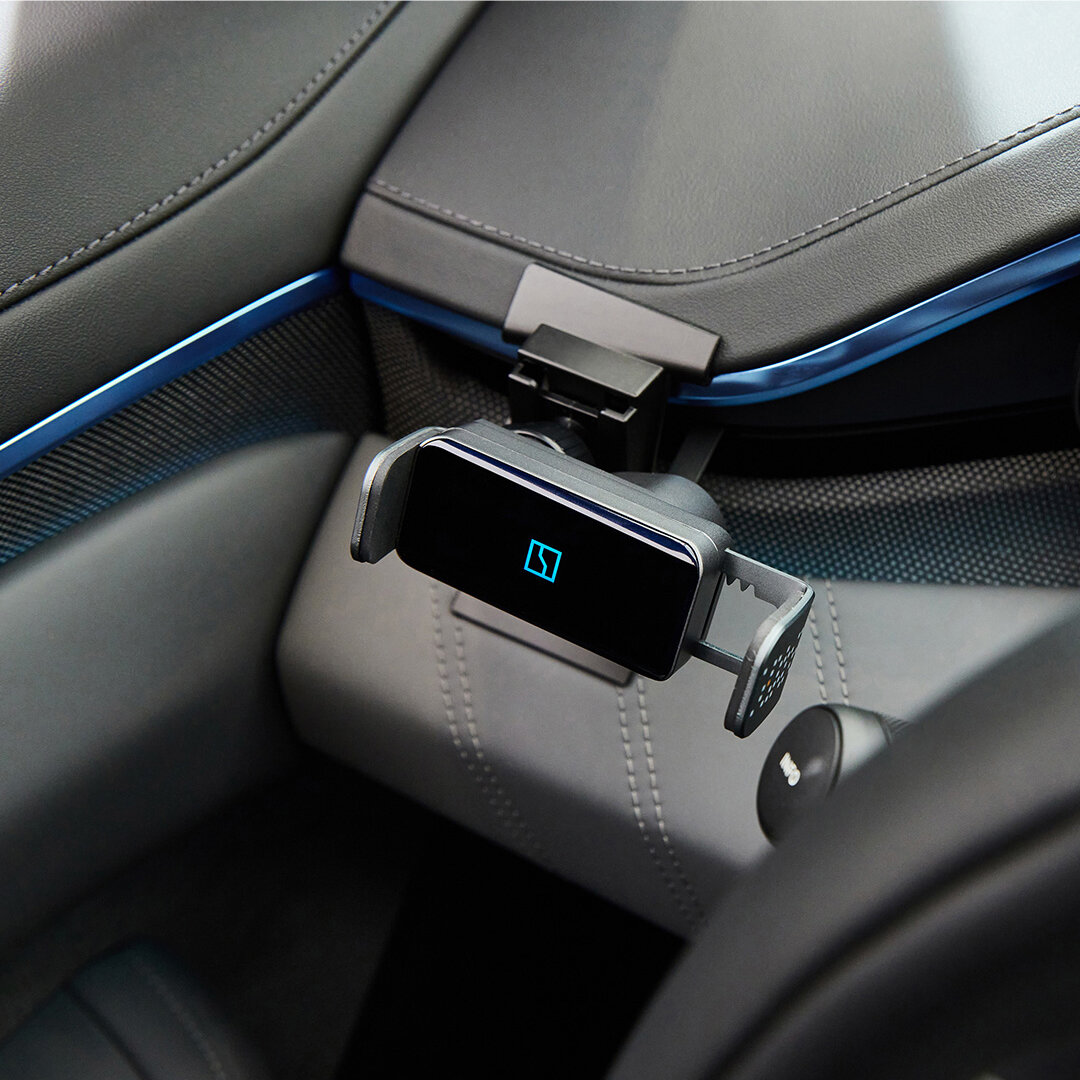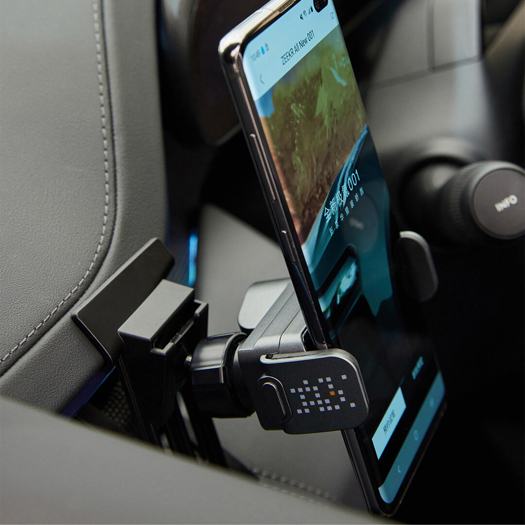 Держатель для смартфона в автомобиль Zeekr 001. С сервоприводом и IR-датчиком. Закрывается автоматически при прикосновении смартфона. Имеет встроенный аккумулятор на 10-14 дней работы без питания. Позволяет заряжать и удобно разместить смартфон под рукой. Не мучаться во время поездок с навигатором или при ответе на сообщения. Устанавливается слева от руля на решетку воздуховода.