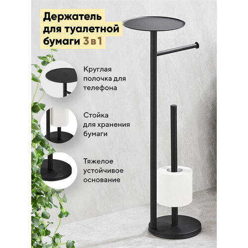 Аксессуар для ванной 3 в 1: держатель для бумаги, стойка для хранения рулонов и полочка для телефона Утяжеленное основание обеспечивает устойчивость конструкции Простая сборка не требующая специальных навыков и дополнительных инструментов (ключ в комплекте) Стойка для хранения бумаги с ограничителем Круглая полочка для телефона или предметов гигиены Занимает мало места