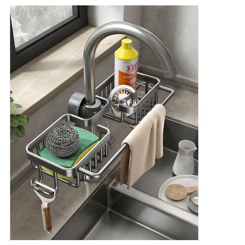 Держатель кухонный для губки на кран, полка на мойку с удобными крючками, полка для душа, вместительная, легко крепится на кран, серебристая металлическая. Органайзер на мойку сэкономит ваше рабочее пространство на кухне , в ванной! Совместим с большинством смесителей с круглой трубой, диаметром от 18 до 28 мм. Хранить губки , моющее средство , мыло в подвесном органайзере для кухни, возле кухонной мойки очень удобно. Подставка для кухонных принадлежностей имеет отверстия для слива и удобный отсек для сушки кухонных полотенец , салфеток и тряпок. Подставка для губки на кухню имеет стильный дизайн , идеальное цветовое сочетание. Держатель кухонных принадлежностей прост в установке , без сверлений, закрути крепеж. Размер полки органайзера 30 x 11 x 5 см, вместительный. Держатель смесителя выполнен из прочного ABS пластика и углеродистой стали. Подставка для губки на кухню прослужит вам долго и станет стильным и функциональным украшением вашего интерьера. Держатель губки на раковину можно также использовать, как полку для ванны для шампуней, гелей и прочих ванных принадлежностей, закрепив на штангу душа или смеситель в ванной. Можно использовать также как: держатель кухонный , для губки , средства , полка для кухни , органайзер для кухни , полка для ванны , кухонный держатель , подставка для кухни , подставка для губки и моющего , держатель смесителя , держатель для ванной , подставка для ванны , органайзер для кухонной губки , для губки и средства для посуды на кухню, полка для средств , держатель кухонный для губки , мыла , тряпки на кухню , держатель для шампуней.