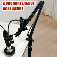 Держатель микроскопа на пантографе - идеальное решение для тех, кто работает в лабораториях, офисах и просто у себя дома. Необходимость фиксации цифрового микроскопа - проблема, которая беспокоит множество пользователей, более того зачастую необходимо менять положение устройства в пространстве. В данном случае портативный микроскоп фиксируется через специальный зажим, который надежно крепит устройство в нужном положении. Пантограф поворотный, наклонный позволяет настроить положение микроскопа в пространстве, регулируя его положение. Комплект крепится через усиленную струбцину к столу или другой горизонтальной поверхности, обеспечивая надежную фиксацию и отсутствие люфта и смещения. Главной особенностью комплекта является осветительный прибор, который крепится к пантографу через прищепку и гибкую ножку - это позволяет добавить подсветку для мелких деталей, регулируя положении лампы в зависимости от поставленной задачи. Таким образом, данный комплект будет полезен тем, кто работает с микроскопом и хочет зафиксировать его в нужном положении и добавить дополнительное освещение. Особенности: - Крепкая фиксация микроскопа - Регулировка положения микроскопа (высота, наклон) - Пантограф поворотный - Усиленная струбцина - Зажим для разных размеров микроскопов - Наличие лампы для подсветки - Регулировка положения лампы через гибкий держатель - Регулировка яркости лампы - Три цвета освещения: холодный, теплый, смешанный - Питание лампы от USB порта, что позволяет работать от различных устройств - Пульт управления на проводе - Плавная регулировка яркости подсветки Характеристики: - Материал: металл, ABS пластик - Цвет: чёрный - Толщина зажима микроскопа: от 1,2 до 5,5 см - Толщина зажима струбцины: до 5 см - Нагрузка на пантограф: до 1.3 кг - Длина колена пантографа: 35 см - Длина ножки лампы: 51 см - Диаметр лампы: 90 мм - Длина кабеля: 140 см - Источник света: светодиод SMD 2835 - Форма: кольцо - Питание: USB кабель (адаптер в комплект не входит) Гарантийный срок: 1 месяц В комплекте: Держатель микроскопа KGS-PAI-3 с подсветкой RL-9bd на пантографе с усиленной струбциной