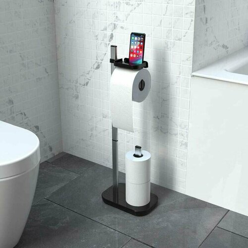 Напольная стойка для туалетной бумаги -идеально скомплектована для удобного хранения рулонов. Имеет прочную конструкцию и устойчивую основу. Не требует монтажа на стену и может быть легко перемещена в любую часть ванной комнаты или туалета. У стойки есть полочка для смартфона, освежителя воздуха или другой принадлежности. Является практичным и удобным аксессуаром, который поможет организовать хранение и использование туалетной бумаги не занимая места на стенах или полках в ванной комнате. Материал: ABS-пластик/сталь/алюминий. Цвет: черный/серебро. Высота: 730 мм. Глубина: 160 мм. Ширина: 250 мм. Монтаж: напольный. Серия: SUI. Держатель для освежителя воздуха: да. Держатель для полотенца: нет.