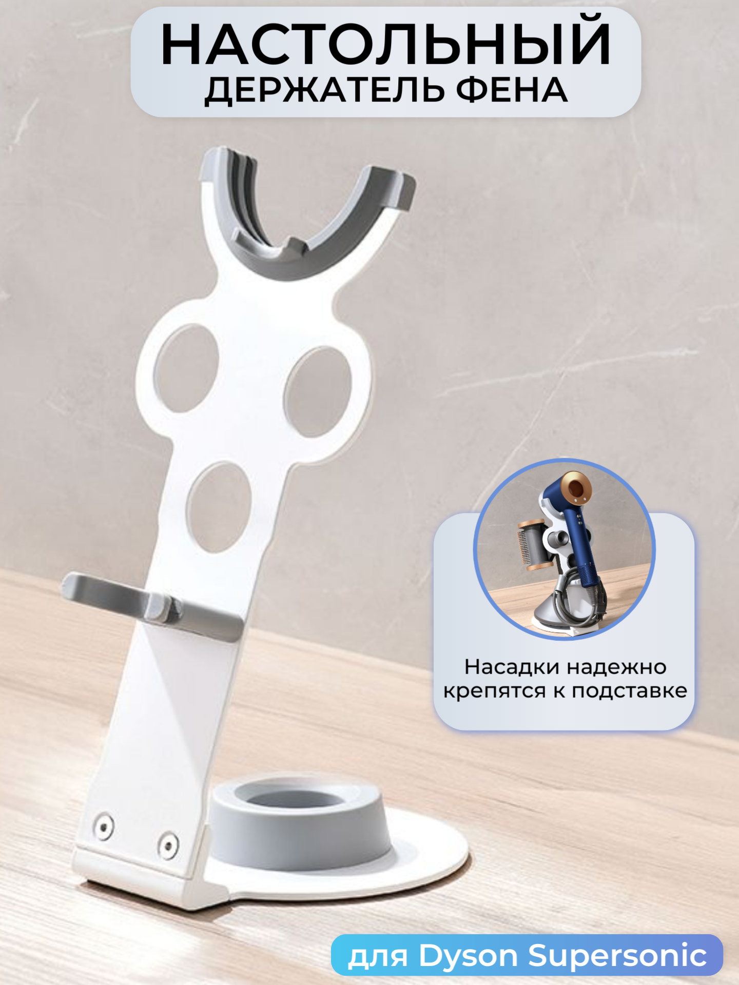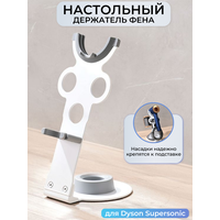 Держатель для фена Dyson Supersonic и насадок. Настольная подставка для фена Dyson удобна в использовании и устойчива на любой поверхности. Материал подставки: оцинкованная сталь + пластик Цвет: белый Фен и насадки в комплект не входят!