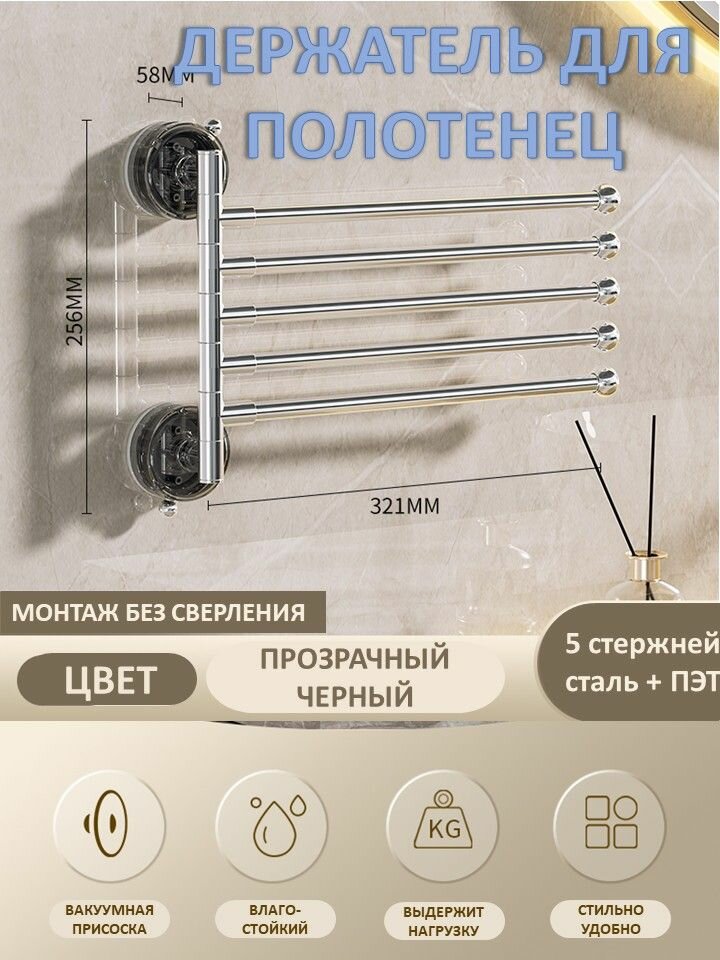 Современная вращающаяся вешалка для полотенец с вакуумными присосками — идеальное решение для организации пространства в ванной комнате. Крепится без сверления, обеспечивая удобное хранение полотенец и банных принадлежностей.