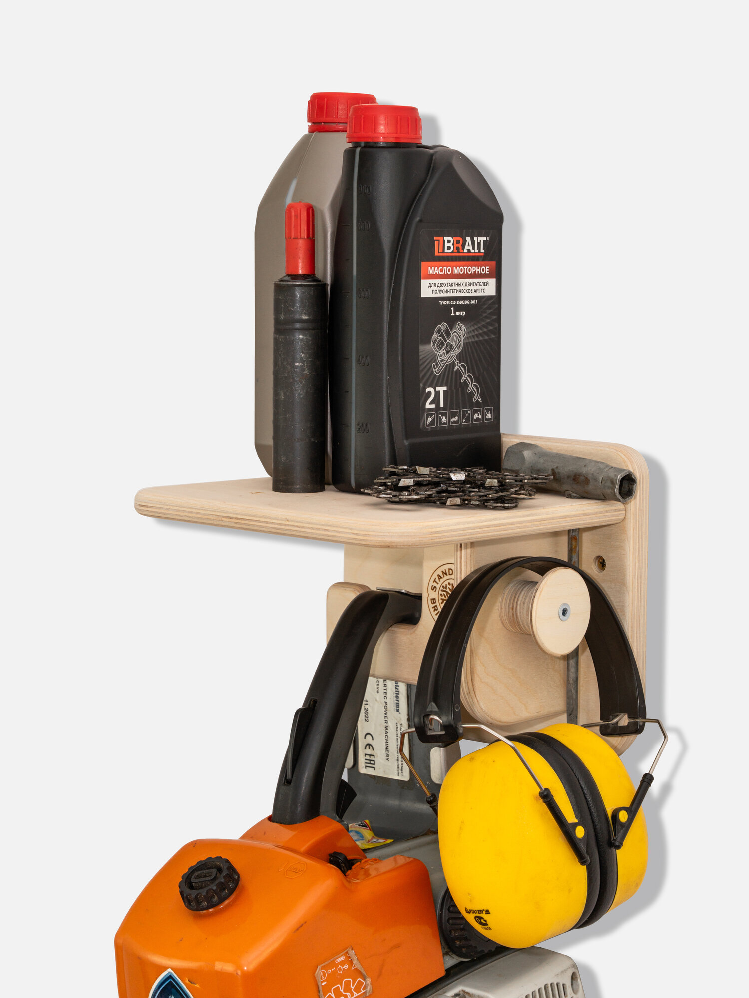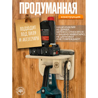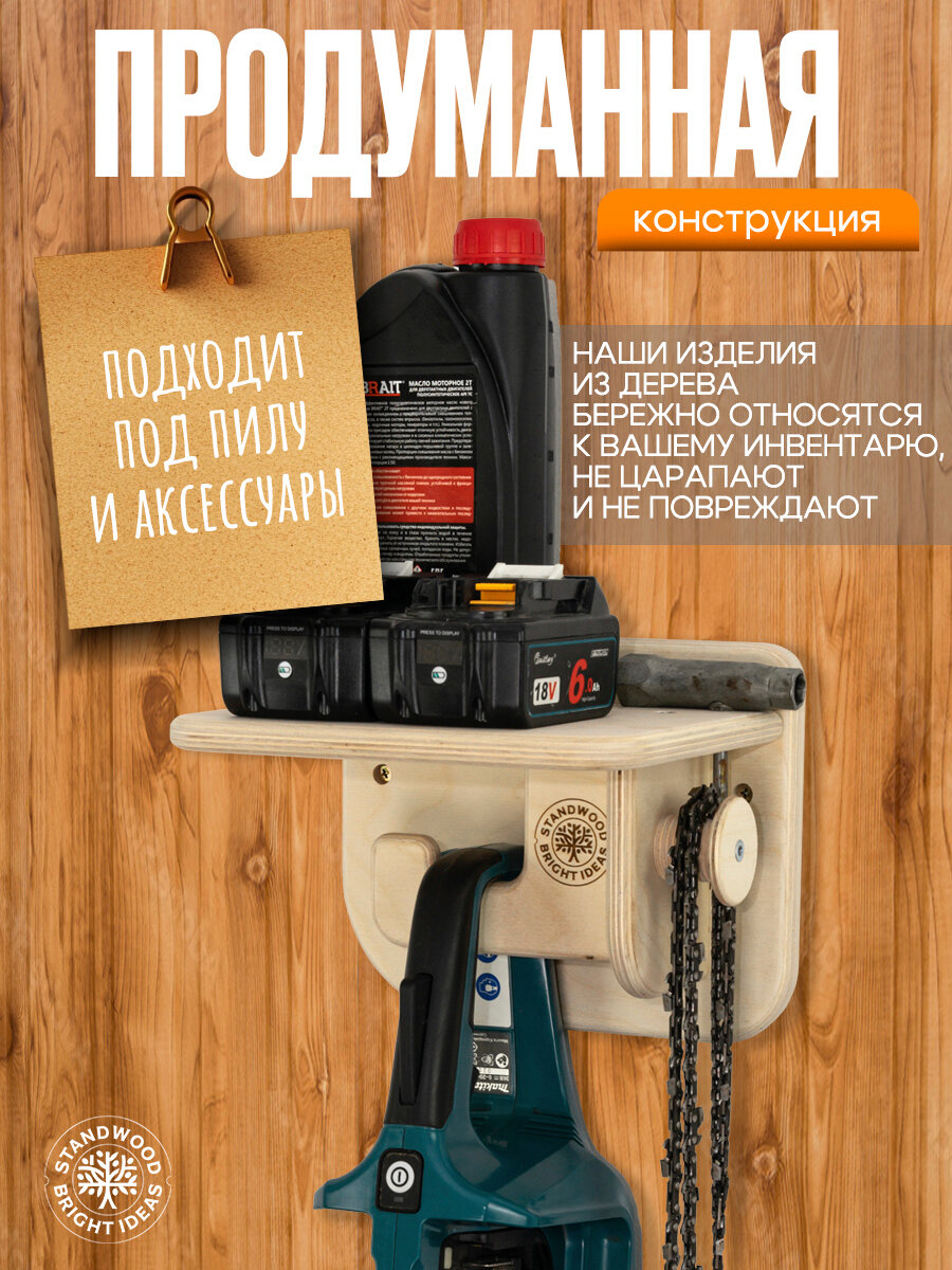 Заботитесь о своих инструментах? Тогда держатель для инструмента - это то, что вам нужно! Держатель для садового инвентаря настенный выполнен из мебельной фанеры, толщиной 15 мм. Это идеальный способ организовать ваше рабочее пространство, инструменты для гаража будут все на своих местах. Полка для инструментов разработана специально для хранения бензопилы в вертикальном положении. На дополнительном деревянном крюке можно разместить защитную маску, очки или запасную цепь. Так же предусмотрено место хранения для свечного ключа и масла. Деревянный кронштейн для бензопилы освобождает ценные квадратные метры для гаража и для мастерской. Бензопила, пила электрическая или аккумуляторная всегда под рукой, когда вам это нужно. Держатель для инструмента настенный - это не просто удобство, это часть грамотного хранение инструментов. Настенный держатель для пилы подходит для всех видов бензопил и легко монтируется на стену в гараже. Бензопила не контактирует с другими инструментами, это минимизирует повреждения. Держатели для бензопилы, а также держатели для садовых инструментов и держатели для инструмента настенные помогут организовать ваш гараж, дачу и мастерскую. Крепление инструмента на стену, в хозблоки и сараи - надежное решение для инструмента. Хотите обустроить свой гараж по высшему разряду? Мы поможем!
