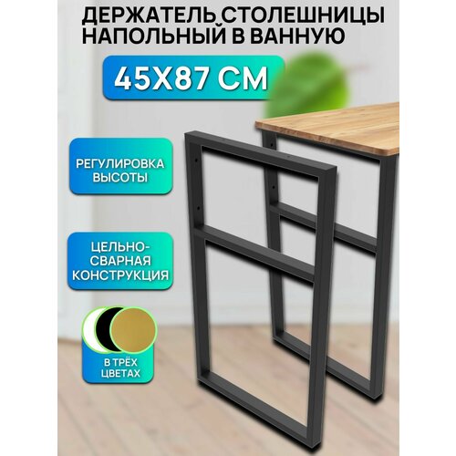 Напольные держатели для раковин со столешницей. Высота 87 см, глубина 45 см. Металлическая часть 85 см +2 см подпятник. Регулировка по высоте с помощью регулируемого подпятника. Сделаны из стальной профильной трубы 40*20 мм и окрашены полимерно-порошковой покраской чёрный муар. Предусмотрены отверстия для крепления столешницы и крепление к стене. Столешница в комплект не входит.