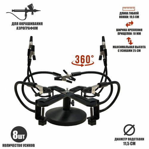 Зажимы-прищепки удобно и надежно фиксируют мелкие детали для краски или аэрографии. Гибкие ножки позволяют установить предметы под любым углом, а свободное вращение ножек на 360 градусов и наклон в любую сторону обеспечивают круговую доступность к окрашиваемой детали.