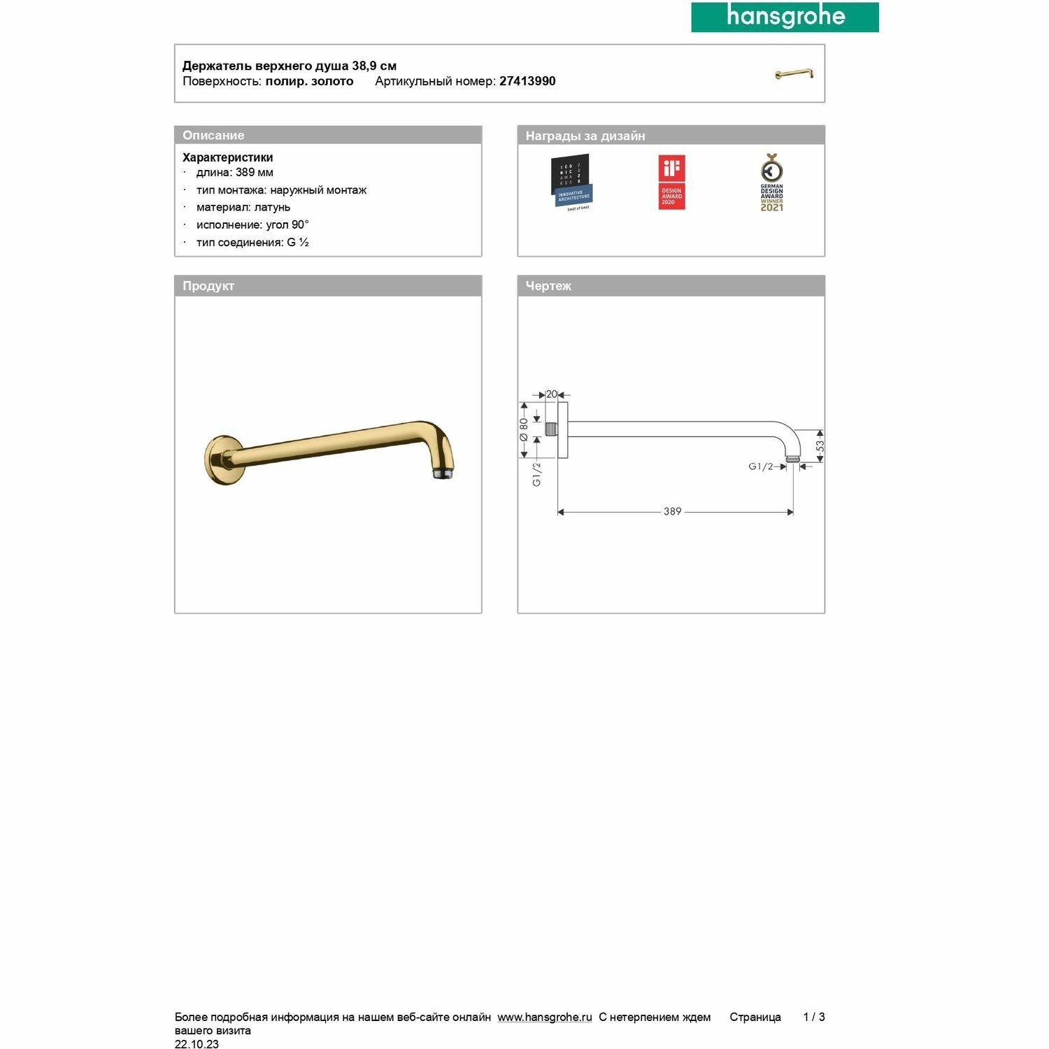 Держатель верхнего душа Hansgrohe (Хансгрое) , настенный, 389 мм, G1/2, цвет: полированное золото 27413990: сравнение цен, характеристики, фото, актуальное наличие и цены.