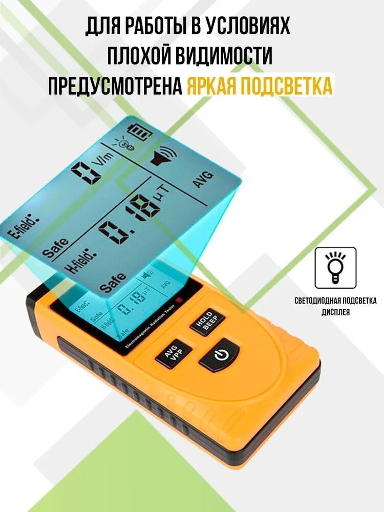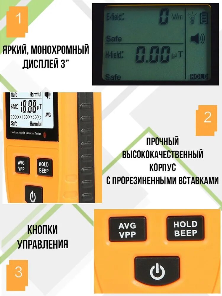 После обработки встроенным датчиком электромагнитного излучения результат измерения отображается на ЖК-цифровом дисплее. Прибор может одновременно проверить электрическое поле и магнитное поле излучения.