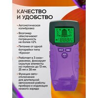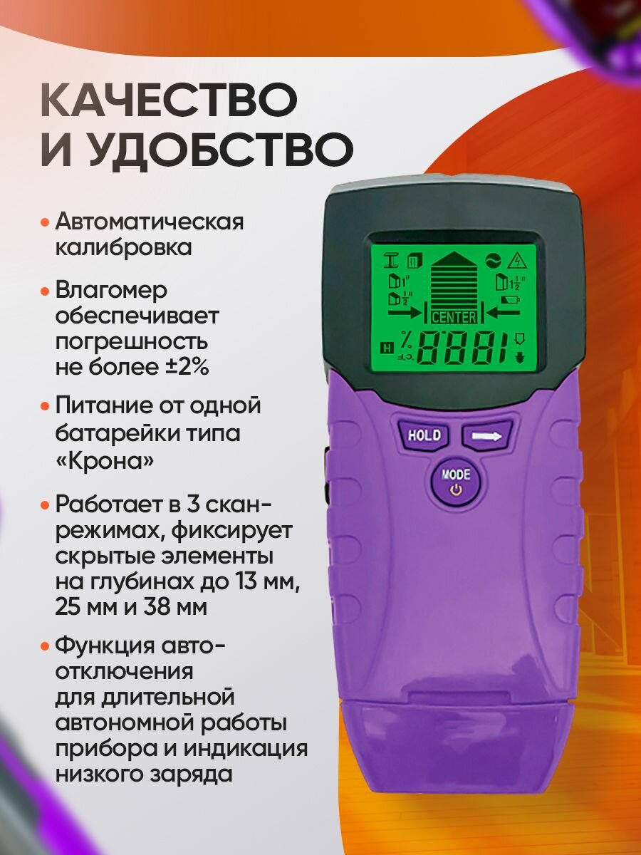 Функция звукового сигнала страхует от пропуска важного места даже при солнечных бликах на экране. Кнопка Hold закрепляет текущие показания, а автоматическая калибровка сохраняет точность даже при частых сменах измеряемого материала. Эргономичный корпус из ударопрочного ABS-пластика надежно лежит в руке и устойчив к высокой механической нагрузке, сохраняя цепкий хват даже в пыльных и влажных условиях стройплощадки.