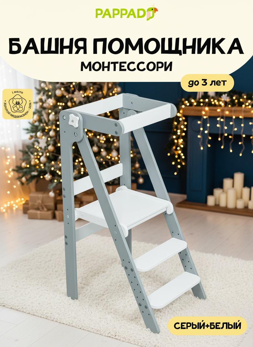 ✔ Безопасность — прочная конструкция с бортиками ✔ Экологичность — нетоксичные материалы и краски ✔ Компактность — складывается за секунды ✔ Универсальность — для кухни, ванной, спальни, творчества ✔ Регулируемая высота — растет вместе с ребенком ✔ В 2025 году "Башня маленького помощника" компании PAPPADO стала победителем премии Золотой медвежонок в номинации Лучшая детская мебель!