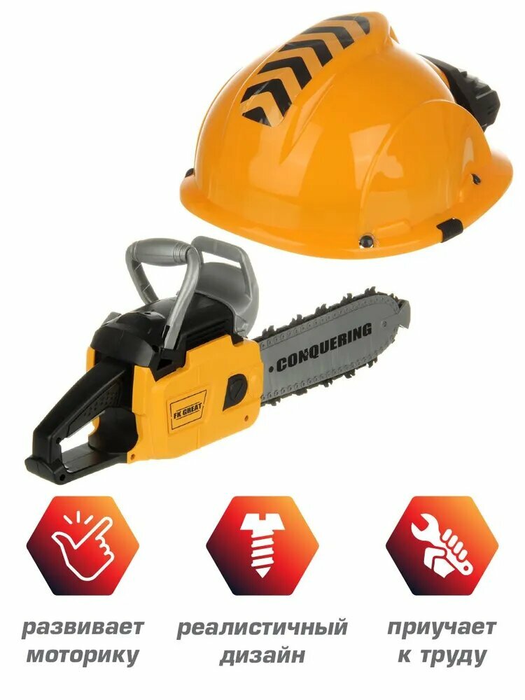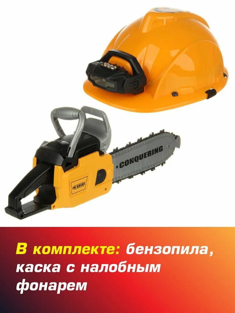 Купить Детская бензопила на батарейках со звуком, Veld Co / Набор инструментов для мальчика / Каска с налобным фонарем для детей с доставкой по всей России.