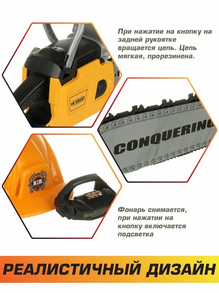 Детская бензопила на батарейках со звуком, Veld Co / Набор инструментов для мальчика / Каска с налобным фонарем для детей: сравнение цен, характеристики, фото, актуальное наличие и цены.