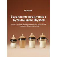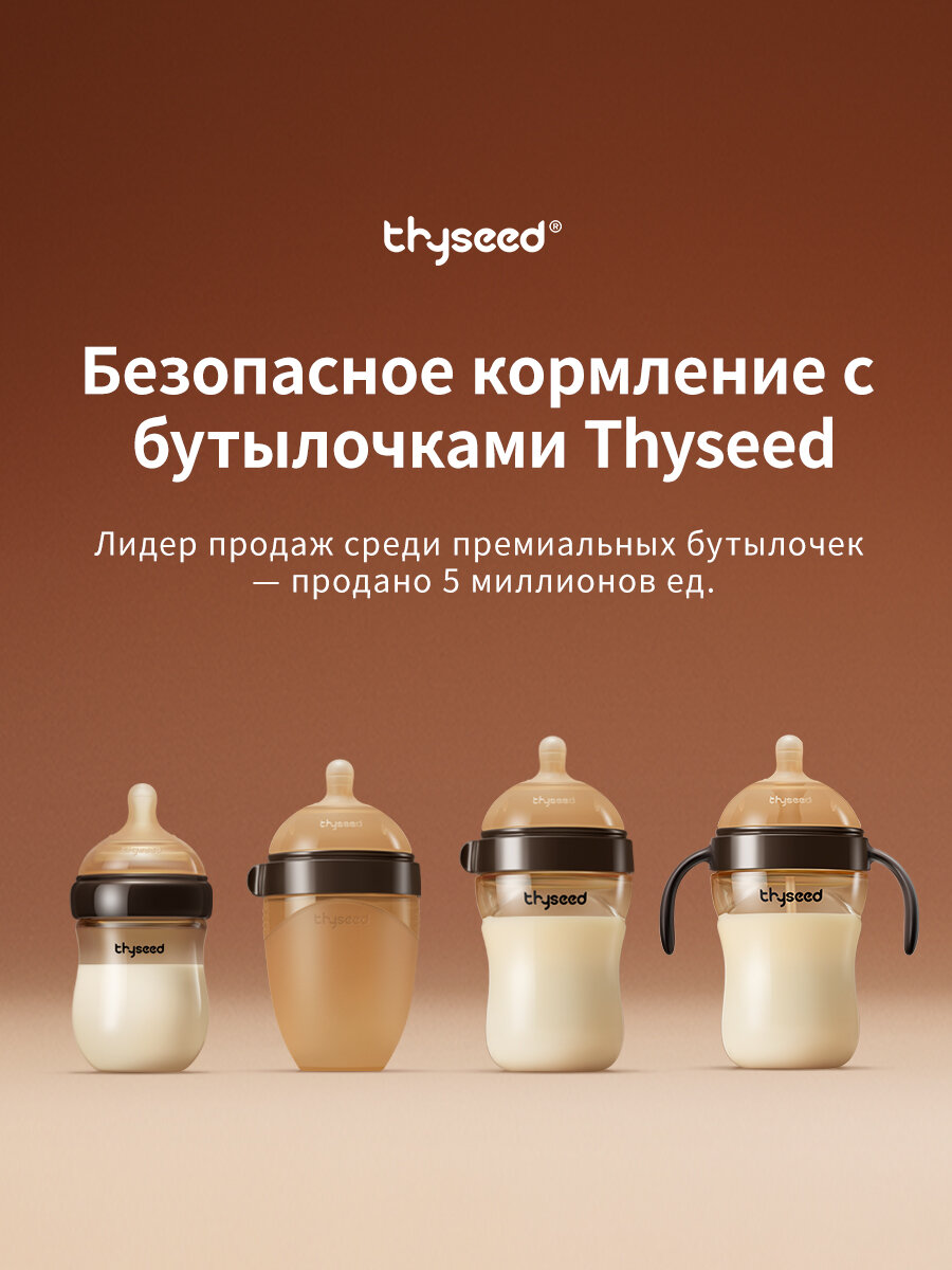 Детская бутылочка Thyseed изготовлена из премиального пластика PPSU (полифениленсульфона). Этот материал объединяет лучшие свойства стекла и пластика. Он безопаснее и долговечнее полипропилена (PP), не содержит бисфенол-А, ПВХ и фталаты, стоек к высокой температуре до 180°. Соска изготовлена из ультрамягкого силикона (20 по шкале Шора) и имеет форму, повторяющую форму маминой груди, делая кормление из бутылочки максимально приближенным к грудному вскармливанию и облегчая переход от грудного вскармливания. Специальные воздушные отверстия в соске не допускают попадание воздуха в молоко, предотвращая появление колик у малыша. Поставщиками материалов для изделий Thyseed являются признанные мировые лидеры отрасли (BASF (Германия) и WACKER (Германия)), что гарантирует безопасность и высокое качество. Каждая бутылочка поставляется с соской, подходящей малышу определенного возраста. По мере взросления малыша, соска может быть заменена на соску с более быстрым потоком (доступно 0-3 мес, 3-7 мес, 7-10 мес, 10+ мес и 18+ мес). Таким образом бутылочка идеально подходит для кормления малыша на всех стадиях взросления и может быть использована как для кормления новорожденных, так и для употребления воды и других жидкостей мылышами более старшего возраста. Специально разработанная цельная трубочка с гравитационным грузиком позволяет малышу пить из бутылочки в любом положении без необходимости запрокидывать голову и предотвращает захлебывание. Широкое горлышко позволяет легко мыть бутылочку без использования щеток и облегчает смешивание молочной смеси, а мерная шкала хорошо видна даже в ночью. Широкое основание обеспечивает хорошую устойчивость бутылочки. Где бы Вы ни находились, бутылочка детская Thyseed поможет с легкостью накормить Вашего малыш.