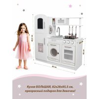 Детский кухонный игровой набор для сюжетных и ролевых игр приведет в восторг каждого ребенка. Подарочный набор со световыми и звуковыми эффектами выполнен в реалистичном дизайне, красивой и нейтральной расцветке, имеет компактные размеры, легко собирается. Набор повара для детей имеет разные игровые секции и подвижные элементы, изготовлен из прочных и долговечных материалов. Есть несколько вариантов сборки, можно менять местами модули. Все углы детской игрушки закруглены для безопасности во время игры. В набор входят комплектующие для сборки кухонного гарнитура, инструкция по сборке, игрушечная металлическая посуда, а именно сковорода, кастрюлька с крышкой, 3 кухонных инструмента. Плита с 2 конфорками, при нажатии на кнопки издает звуки жарки, бульканья, конфорки подсвечиваются красным. Конфорки работают по отдельности и вместе, то есть можно их включить одновременно. Лампочка внутри микроволновой печи подсвечивается, микроволновка издает звук работающей техники. Игрушечная кухня имеет кран с выключателем, есть функция подачи воды. Вставляем в кран батарейки и помещаем его в раковину. Наливаем воду в раковину, поворачиваем ручку смесителя, пойдет вода. Возвращаем ручку в исходное положение, вода течь прекращает. Выключатели плиты поворачиваются, издают звук щелчка. Все дверцы модуля можно открыть и заглянуть внутрь. Трубка телефона снимается с базы, кнопки не нажимаются. Есть доска для записей мелом и полочки для хранения посуды и продуктов. Такая детская деревянная игровая кухня с посудой станет замечательным подарком детям, как мальчику, так и девочке на новый год, день рождения или любой другой повод. Внимание. Для сборки потребуется отвертка, в набор не входит. Оптимальное количество воды для раковины 1 литр. Кран работает от 2 батареек ААА, не входят в комплект. Варочная панель работает от 2 батареек ААА, не входят в комплект. Микроволновка работает от 2 батареек ААА, не входят в комплект. Вес 14 кг. Товар упакован в надежную коробку плотностью 180 г/м2, пройден краш-тест. МДФ, металл. Размеры собранной кухни 82х28х85,5 см. Глубина с ручками 30 см. Высота от пола до столешницы 46 см. Размеры варочной панели 25х17х3 см. Размеры сковороды с крышкой 17х10х4 см. Размеры лопатки 14х3х1,5 см. Размеры упаковки 89х34х16 см.