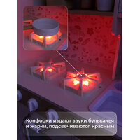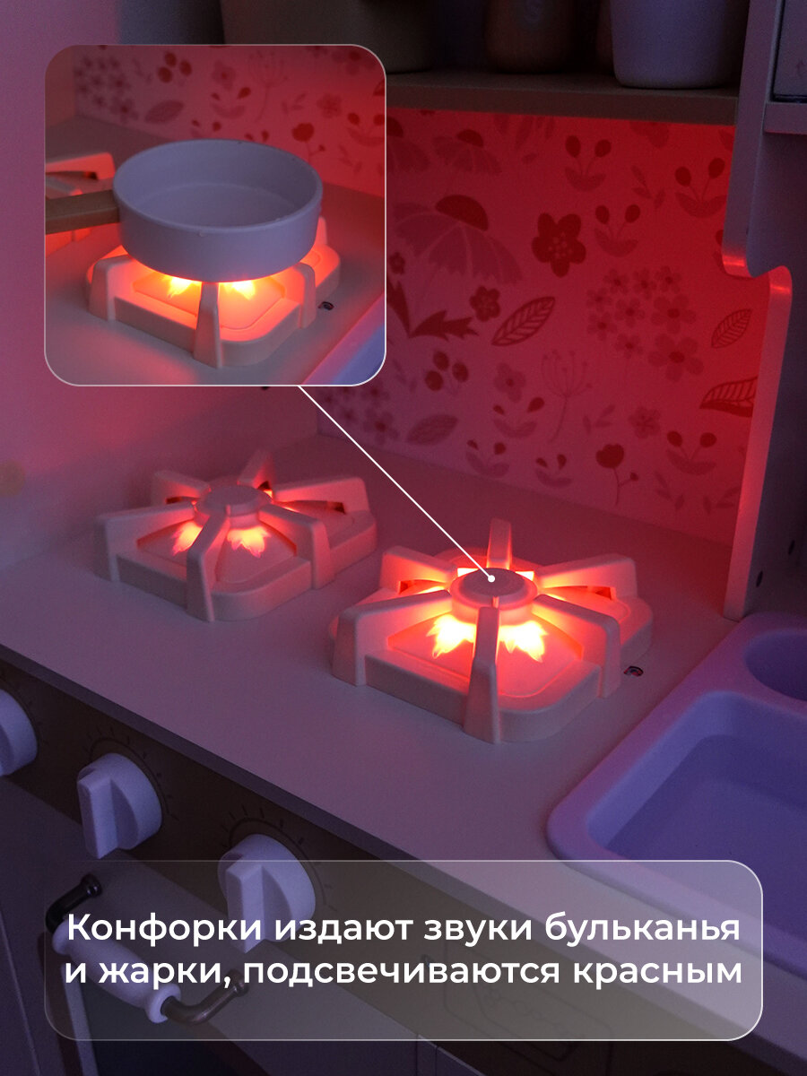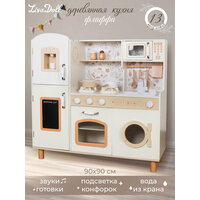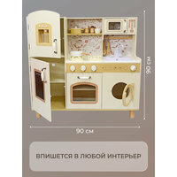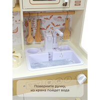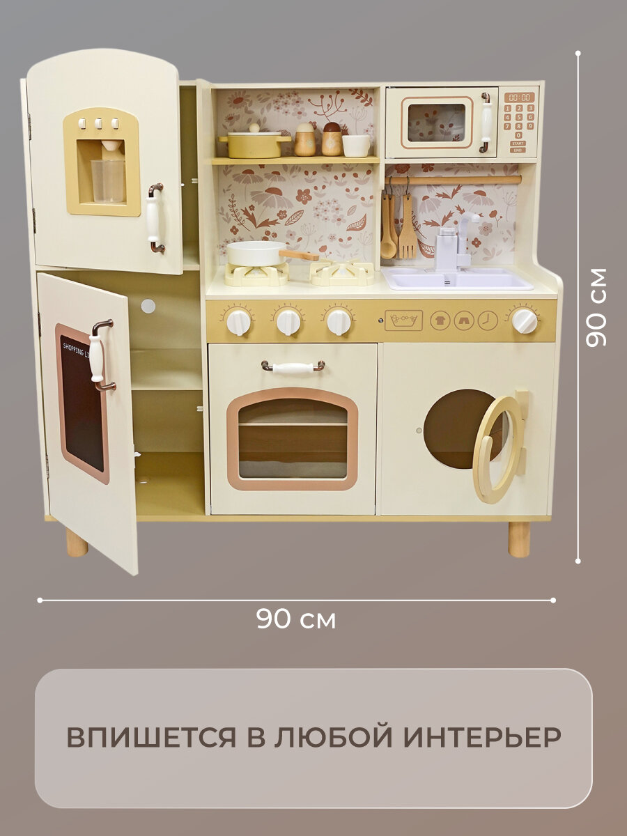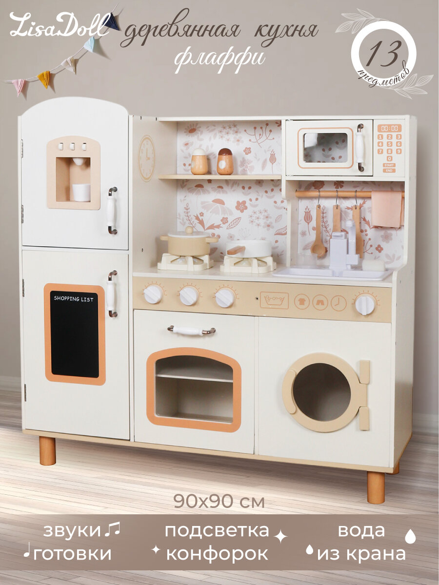 Деревянная кухня, это роскошный кухонный гарнитур с варочной панелью и с краном с функцией подачи воды. Звук и свет, высокое качество исполнения, столовые приборы и посуда в наборе, дизайн посуды выполнен под керамику, доска для записей. Детская деревянная игрушка имеет красивую и универсальную расцветку, отлично подходит как девочкам, так и мальчикам, впишется в любой интерьер. Детский кухонный игровой набор для сюжетных и ролевых игр выполнен в реалистичном дизайне. Детская деревянная игровая кухня с посудой изготовлена из прочных и долговечных материалов. Подарок девочке и мальчику на Новый год, День рождения, 8 марта, 23 февраля, разные игровые секции, игрушечная кухня с подвижными элементами. Набор повара для детей, в игровой форме развивающий важные социальные навыки ребенка. В наборе детали для сборки кухни, кран, кастрюля, сковорода с крышкой, 3 кухонных инструмента, 2 солонки, чашка, стакан, губка, 2 салфетки. Функционал кухни. 1. Конфорки издают звуки бульканья и жарки, подсвечиваются красным. Конфорки работают, если поставить на них посуду, нажимаются специальные кнопочки на конфорках. 2. Ручки крутятся на 360 градусов в обе стороны с потрескивающим звуком. 3. Дверцы микроволновки, ящика имитации кулера, шкафчика и духовки открываются. Дверца барабана открывается. 4. Отсек с кулером. Нажимаются кнопки, имитация кулера. В отсек можно поставить стакан. 5. На доске можно писать мелом. 6. Кухонные инструменты вешаются на крючки. 7. Игрушка для девочки имеет кран с выключателем. Установите в кран батарейки, кран вставьте в раковину, раковину наполните водой. Поверните ручку, из крана пойдет вода, вода будет идти до тех пор, пока не вернем ручку в исходное положение. Излив крана крутится. 13 аксессуаров без учета крана и деталей для сборки кухни. Кран работает от 2 батареек АА, не входят в комплект. Каждая из конфорок работает от 3 батареек LR44, входят в комплект. Подарочный набор изготовлен из МДФ, дерева, пластика, есть текстиль. Деревянная кухня, кухонные инструменты, солонки. Оптимальный объем воды для работы раковины 1,1 литра. Игрушечная кухня имеет размеры с учетом ручек 90х33х90 см. Ширина без учета ручек 30 см. Высота от пола до столешницы 50 см. Размеры сковороды с крышкой 18х11х5 см. Размеры кастрюли 14х10х4 см. Размеры солонки 4х6 см. Размеры лопатки 13х4х1 см. Размеры чашки 6х5х4 см. Размеры губки 8х2х5 см. Размеры длинной прямоугольной салфетки 23х9 см. Размеры стакана 5х7 см. Размеры коробки 40х17х100 см.