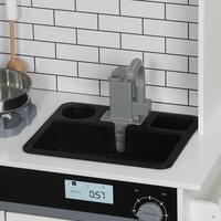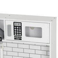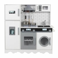 Комплектация. Детали для сборки кухни, кастрюля, сковородка, крышка, 3 предмета кухонной утвари, телефон, тряпка, губка для мытья посуды, инструкция по сборке на русском языке. Функционал. Варочная панель. Конфорки включаются, когда ставим на них посуду. Издают звуки жарки и бульканья, красная подсветка конфорок. Льдогенератор. Ставим стакан в отверстие ледогенератора, кубик льда кладём в отверстие с внутренней стороны льдогенератора. Нажимаем на рычажок, кубик льда упадёт в стакан. Кран вставляется в раковину. Включается поворотом рычажка смесителя, вода будет литься, пока не вернём ручку крана в исходное положение. На крючки можно повесить кухонные приборы. Дверцы льдогенератора, холодильника, микроволновки, духовки, и барабан стиральной машины открываются. Микроволновка включается закрытием дверцы. Издаёт звук разогревания пищи, звук окончания работы, подсвечивается лампочка. Левая кнопка на вытяжке включает свет, правая звук вытяжки. Эффекты сохраняются, пока не нажмём на кнопки повторно. Ручки плиты и раковины прокручиваются с потрескивающим звуком на 360 градусов. Телефонная трубка снимается, кнопки декоративные. Стиральная машинка. При закрытии дверцы барабана издаёт звуки стирки, меняющаяся подсветка барабана. Вытяжка работает от 2 батареек ААА, не входят в комплект. Кран работает от 2 батареек АА, не входят в комплект. Каждая конфорка работает от 3 батареек LR44, входят в комплект. Микроволновка работает от 3 батареек LR44, входят в комплект. Барабан стиральной машины работает от 3 батареек LR44, входят в комплект. Оптимальный объем раковины 1 литр. 58 предметов без учёта инструкции по сборке. МДФ, кухонные приборы и корпус кухни изготовлены из древесины, посуда из металла, пластик. Размер кухни 91х33х83 см. Ширина кухни без учёта ручек 30 см. Высота от пола до верхней точки столешницы 50 см. Размер сковороды с крышкой 22х14х5 см. Размер кастрюли 19х14х7 см. Размер стакана 6х6х8 см. Размер кубика льда 2 см. Размер салфетки 12х18 см. Размер губки для мытья посуды 8х5х2 см. Размер деревянной лопаточки 4х2х18 см. Размер упаковки 102х18х50 см.