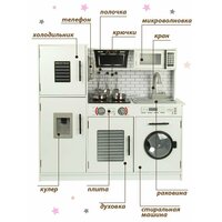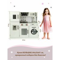 Деревянная кухня Нова, это роскошный кухонный гарнитур с варочной панелью, кулером и краном с функцией подачи воды. Звук и свет, высокое качество исполнения, посуда из металла. Детская деревянная игрушка имеет красивый и нейтральный дизайн, отлично подходит как девочкам, так и мальчикам, впишется в любой интерьер. В комплекте детали для сборки кухонного гарнитура, игрушечная металлическая посуда, а именно сковорода, кастрюлька с крышкой, 3 кухонных инструмента, инструкция по сборке. Подарочный набор имеет звуковые и световые эффекты. Варочная панель на 2 конфорки. При нажатии на кнопки издает звуки жарки, бульканья, конфорки подсвечиваются красным. Конфорки работают по отдельности и вместе, то есть можно их включить одновременно. Игрушка для девочки имеет кран с выключателем. Принцип работы крана: 1. Вставляем в кран батарейки, кран вставляем в раковину. 2. Наливаем в раковину воду, поворачиваем ручку крана, из крана идет вода. Возвращаем ручку в исходное положение, вода течь прекращает. Излив смесителя крутится. Принцип работы кулера: 1. При нажатии на черный язычок издает звук бульканья. 2. Лампочка возле надписи Горячее подсвечивается красным, лампочка возле надписи Холодное подсвечивается зеленым. Все дверцы модуля можно открыть и заглянуть внутрь. Открывается дверца барабана стиральной машинки. Выключатели плиты поворачиваются на 360 градусов с потрескивающим звуком. Трубка телефона снимается с базы, кнопки не нажимаются. Детский кухонный игровой набор для сюжетных и ролевых игр выполнен в реалистичном дизайне. Детская деревянная игровая кухня с посудой изготовлена из прочных и долговечных материалов. Подарок девочке и мальчику на Новый год, День рождения, 8 марта, 23 февраля, разные игровые секции, игрушечная кухня с подвижными элементами. Набор повара для детей, в игровой форме развивающий важные социальные навыки ребенка. Внимание, для сборки потребуется отвертка, в набор не входит. Оптимальный объем воды для раковины 1 л. Кран работает от 2 батареек ААА, не входят в комплект. Варочная панель работает от 2 батареек ААА, не входят в комплект. Кулер работает от 2 батареек ААА, не входят в комплект. МДФ Е1, пластмасса, металл. Нетто 12,5 кг. Брутто 14 кг. Товар упакован в коробку плотностью 180 г/м2, пройден краш-тест. Игрушечная кухня имеет размеры 84х25х81 см. Глубина с ручками 27 см. Высота от пола до столешницы 45 см. Размеры варочной панели 25х17х3 см. Размеры сковороды с крышкой 17х10х4 см. Размеры лопатки 14х3х1,5 см. Размеры коробки 90х34х17 см.