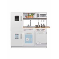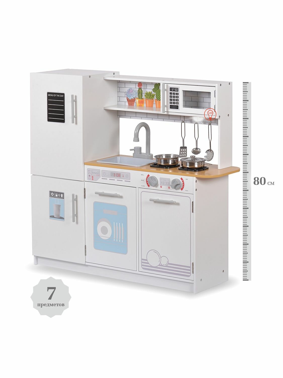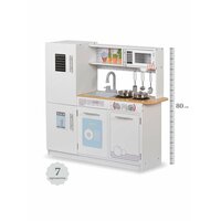 Большая детская кухня прекрасно подойдет для детской комнаты и впишется в любой интерьер. Реалистичность дизайна делают деревянную кухню очень популярной в качестве подарка не только девочке, но и мальчику. Играя с ней, ребенок развивает творческие способности, социальные навыки, моторику. Игровая кухня очень удобная и функциональная. Все дверцы открываются. В комплекте есть LED-подсветка (крепится на двусторонний скотч) , которую можно установить над рабочей поверхностью. Основные функции игрового набора: 1) выключатели поворачиваются; 2) плита с 2 конфорками. Размер в собранном виде 80х86х24 см, высота от пола до столешницы 45 см, раковина с краном 21х15х5 см. В комплекте есть игрушечная металлическая посуда: сковорода с крышкой 10х17х2 см, кастрюля 10х10х3см, половник, лопатка, дуршлаг по 13 см.