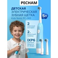 Электрическая зубная щетка детская PECHAM Kids Sonic PC-083, от 5+ круглая, электрическая щетка для мальчиков синяя на батарейках. С 5 лет. 2 вращающиеся насадки