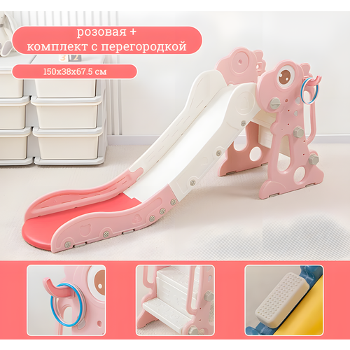 Детская горка с динозавром, складная, многофункциональная, розовая + комплект с перегородкой