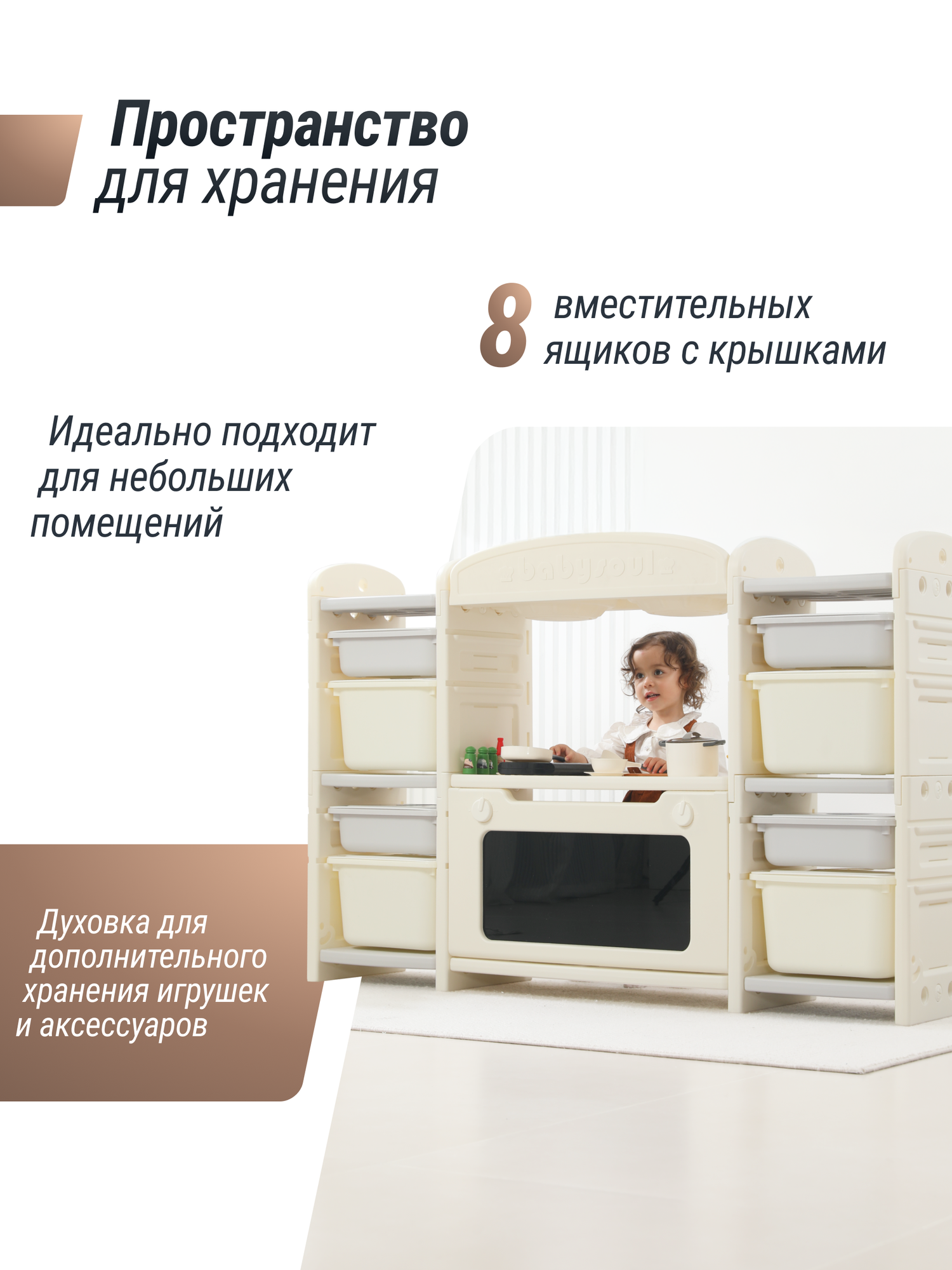 Развивающая игрушка мини кухня по системе Монтессори способствует развитию мелкой моторики, логического мышления и креативности. Ребенок сможет изучать основы приготовления пищи, комбинировать различные ингредиенты и даже разрабатывать свои собственные рецепты! В процессе игры малыш научится различать продукты, кухонные принадлежности, столовые приборы и поймет, как работает плита и духовка. А 8 вместительных ящиков с крышками можно использовать для хранения посуды и продуктов из набора.