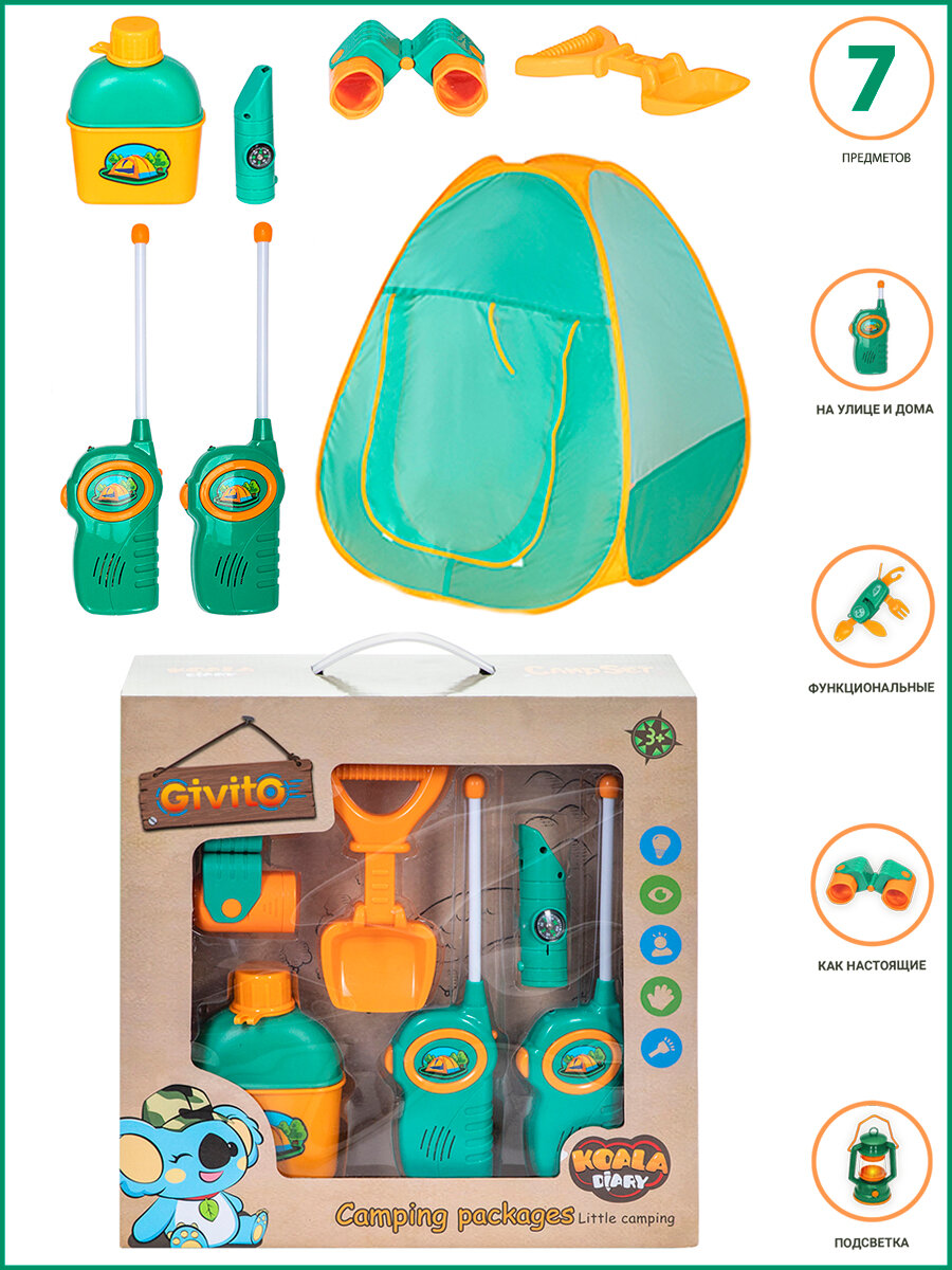 • Комплектация: палатка, фляга, лопатка, бинокль, рации 2 шт, мультиприбор (свисток, фонарик, компас).