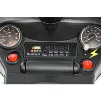 В каталке есть медиа-панель для прослушивания музыки с разъемами USB, mp3, SD. Сиденье мягкое из эко-кожи. По бокам ребенок огражден защитным бампером, а снизу с каждой стороны выдвигаются подножки.