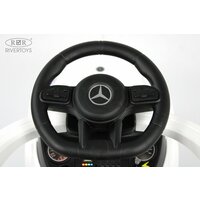 RiverToys Z001ZZ-B –лицензионный детский толокар с аккумулятором (6В, 4,5 А), выполненный в виде стильной копии Mercedes-Benz G63. Модель имеет высокую съемную родительскую ручку, резиновые колеса, подсветку передних и задних фар, а также музыкальный руль и звуковые эффекты.