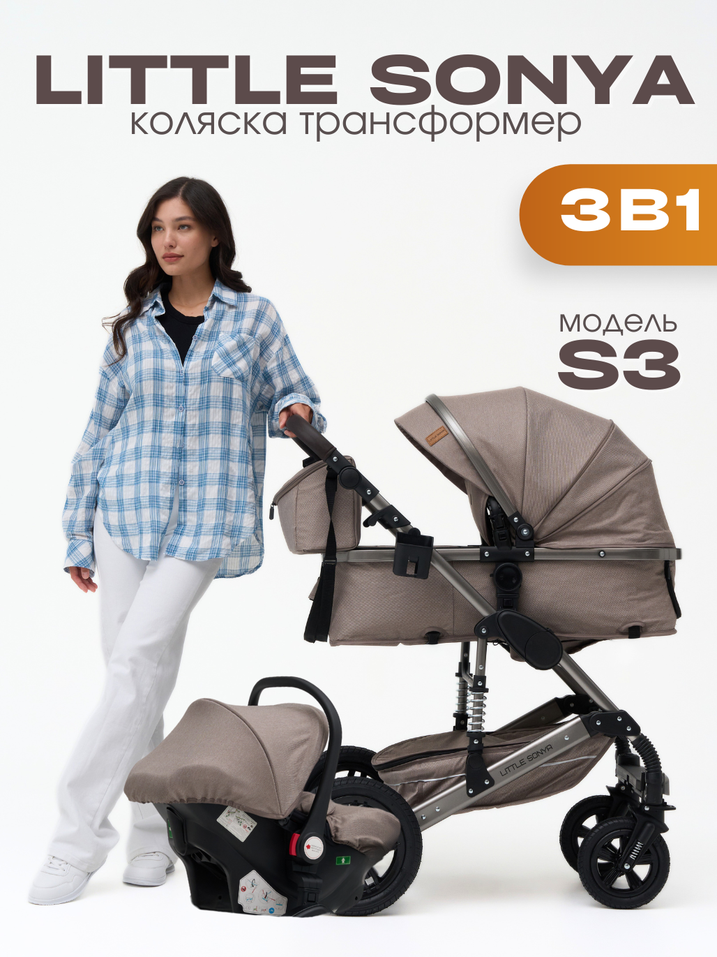 Детская коляска 3 в 1 Little Sonya S3 для новорожденных трансформер с автокреслом, Бежевый: сравнение цен, характеристики, фото, актуальное наличие и цены.