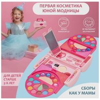 Любая девочка, видя, как мама пользуется косметикой, начинает подражать и хочет накраситься. Набор декоративной косметики для девочек подарит массу положительных эмоций, а также позволит научиться сочетать цвета и ухаживать за собой. Бьютибокс с гипоаллергенной декоративной детской косметикой в кейсе - это прекрасный подарочный набор с косметикой для девочек от 3 лет. Косметика для макияжа легко смывается, поэтому не нужно переживать, что он сможет запачкать одежду или долго не смываться с кожи. Набор косметики в удобном чемоданчике можно легко носить с собой. Лаки для ногтей сделаны на водной основе, не разрушают и не сушат ногтевую пластину ребенка, легко снимаются. Косметика содержит минимум пигмента, состоит из натуральных компонентов, безопасна для детской кожи. В состав набора входят (артикул 96509337, комплектацию остальных наборов Вы сможете посмотреть на фотографиях связанных товаров): тени для век, румяна, пудра, блеск для губ, губная помада, лак для ногтей, аппликаторы для теней, зеркало, кисточки для макияжа, заколки для волос, спонж, пилочка для ногтей. Яркие тени и блестки помогут вашей юной красавице выразить свою индивидуальность на максимум и проявить творчество в создании своего идеального макияжа. Игровой набор детской декоративной косметики располагается в красивом и компактном сундучке (косметическом чемоданчике), который при необходимости легко взять с собой в гости, детский сад, в путешествие. Цвета при нанесении на кожу имеют оттеночное свойство и полупрозрачную текстуру. Такие подарочные наборы -отличный подарок на день рождения. Это приятный сюрприз дочке, ее подружке из садика или сестре.