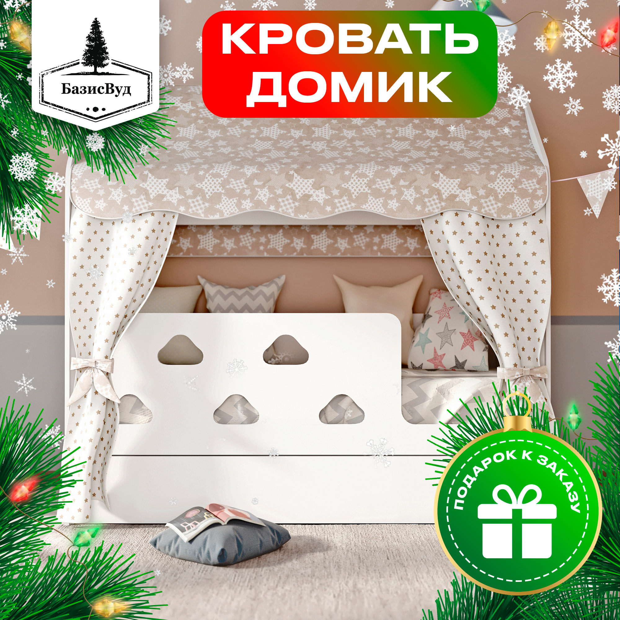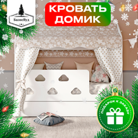 Купить Детская кровать домик с текстилем и ящиком (бежевый, со звездами, вход справа) «Облачка» с доставкой по всей России.