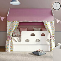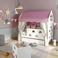 Кровать детская домик «Облачка» с текстилем (розовый, с единорогами)